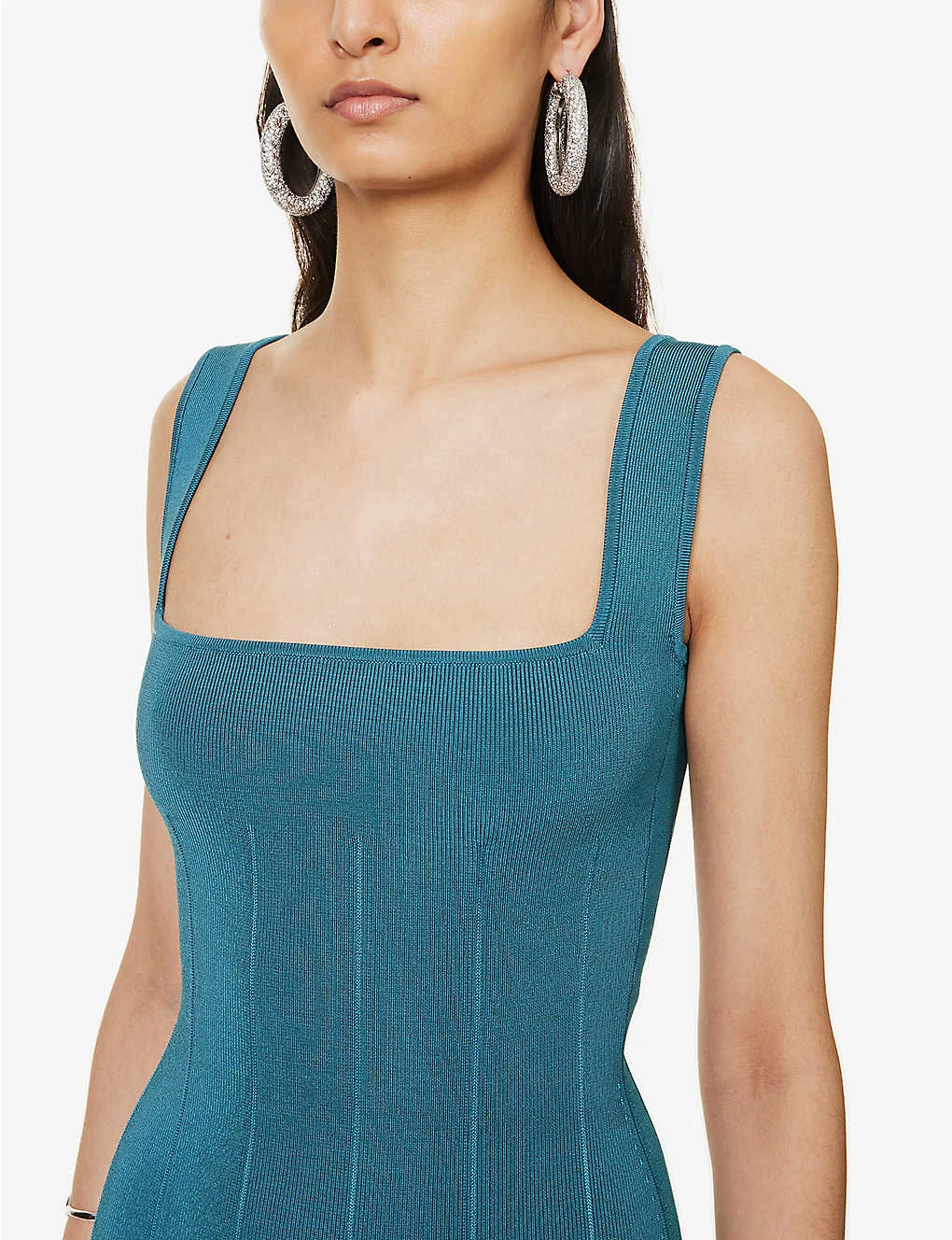 - Slim fit, square neckline, sleeveless, ribbed texture, pleated trim at hem