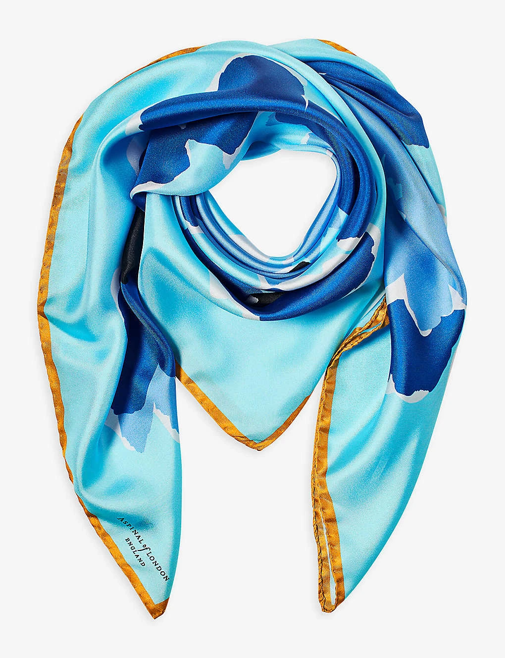- Square shape, floral print, logo print in the corner, contrasting border, hand-rolled edges