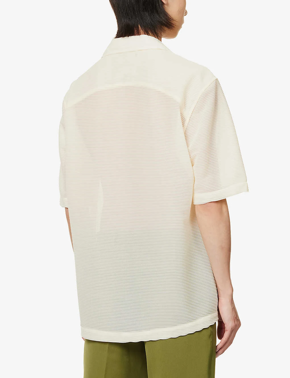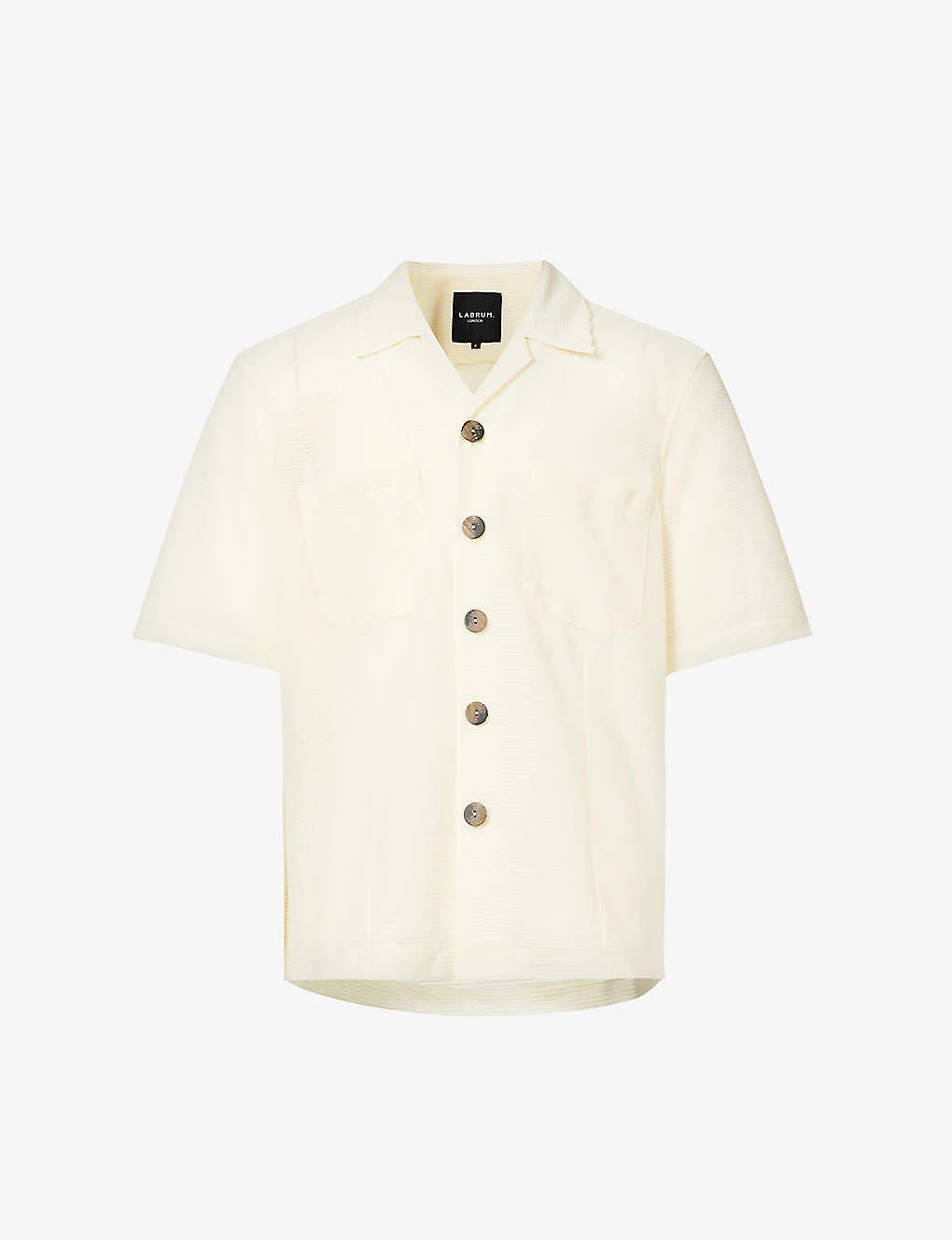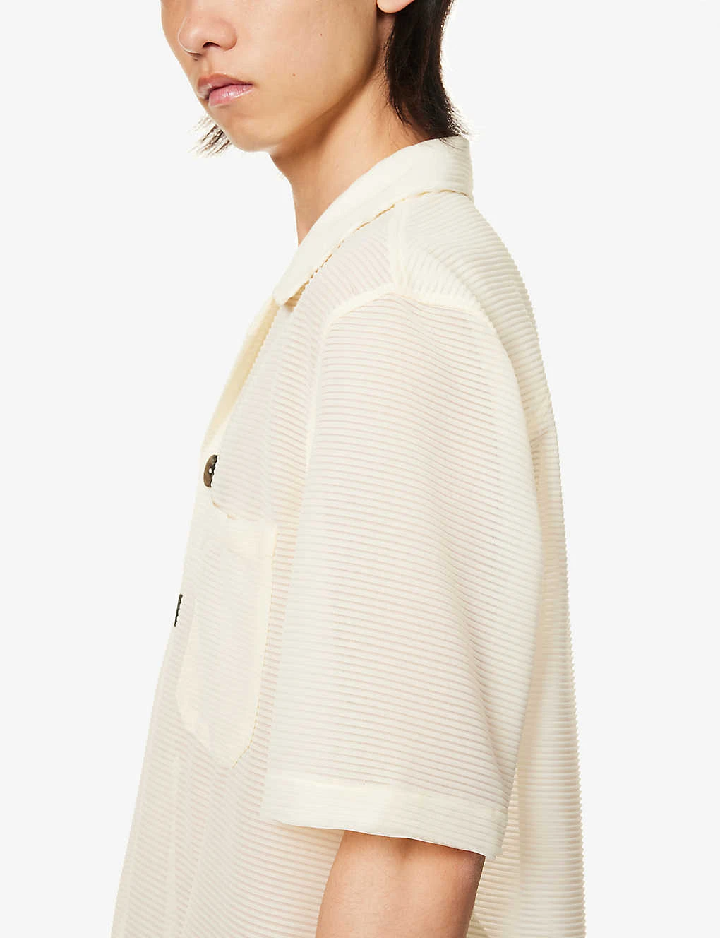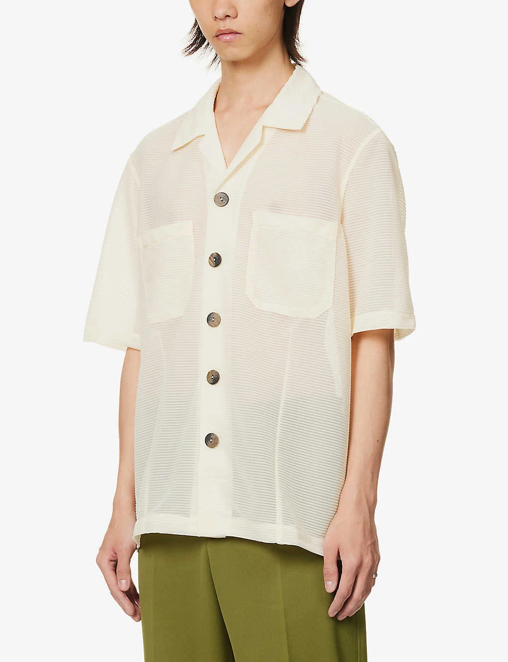 - Relaxed fit, V neck, collar, short sleeves, two patch pockets and darts at front, straight yoke at back, all over striped pattern, textured, straight hem