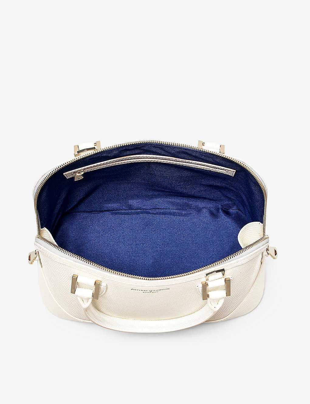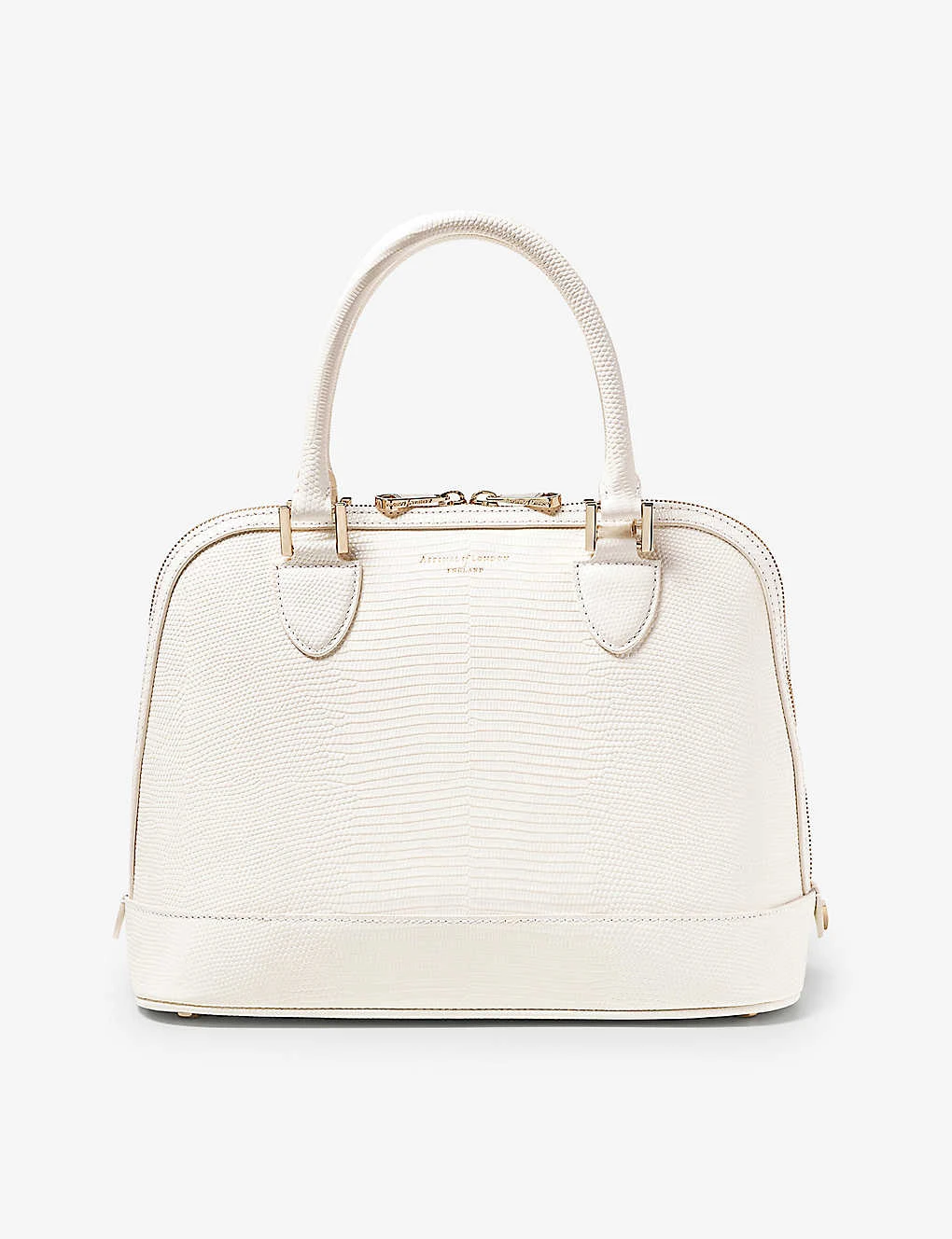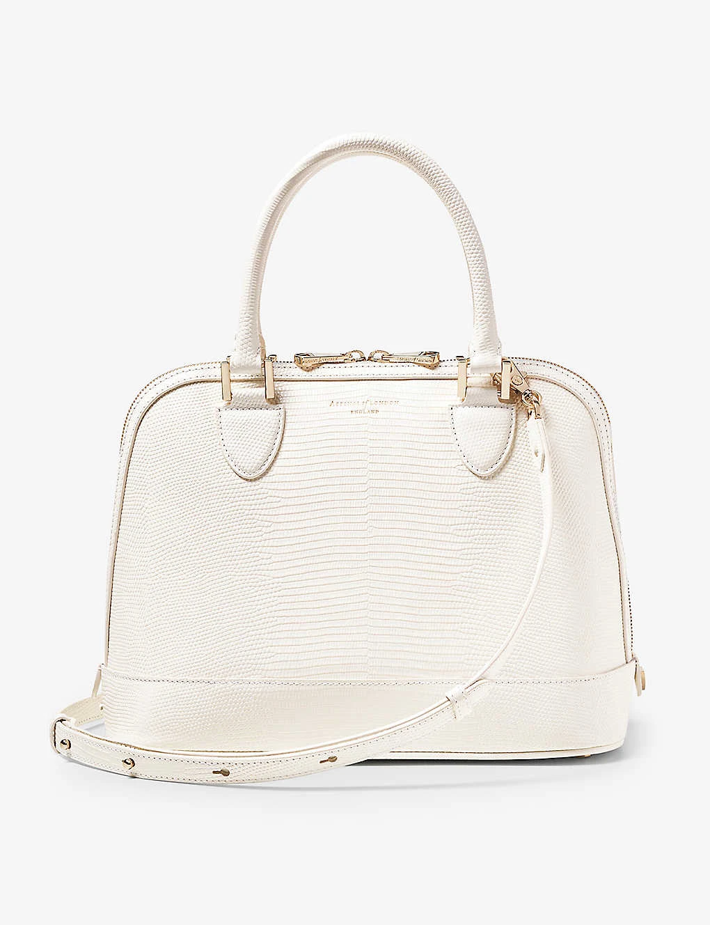 - Top handle, detachable shoulder strap, structured shape, logo at front, lizard emboss, branded hardware, main compartment, zip pocket at interior, slip pocket at interior, grosgrain lining, protective base feet