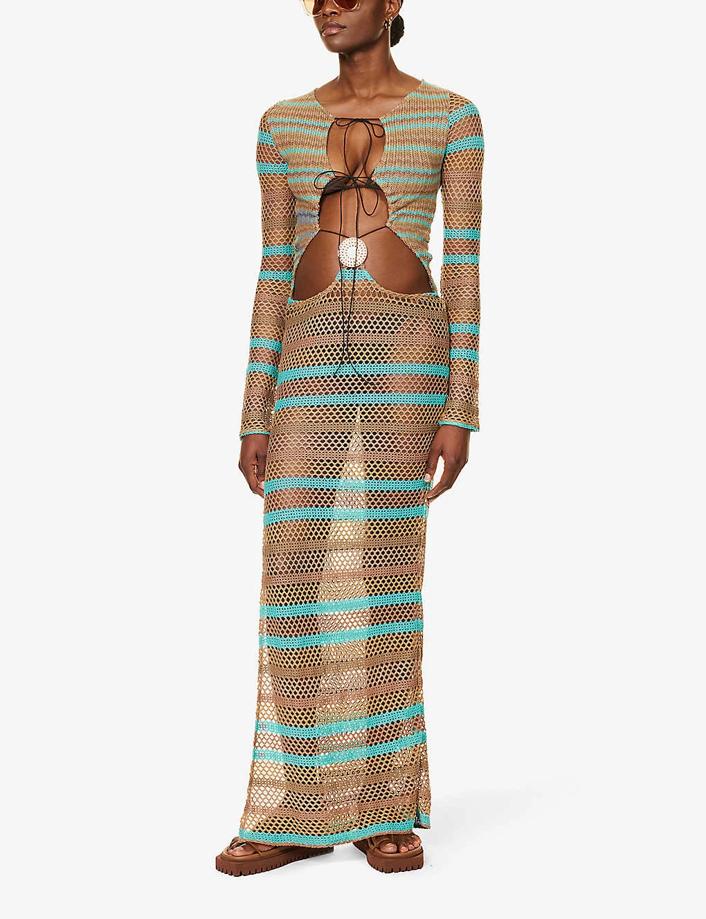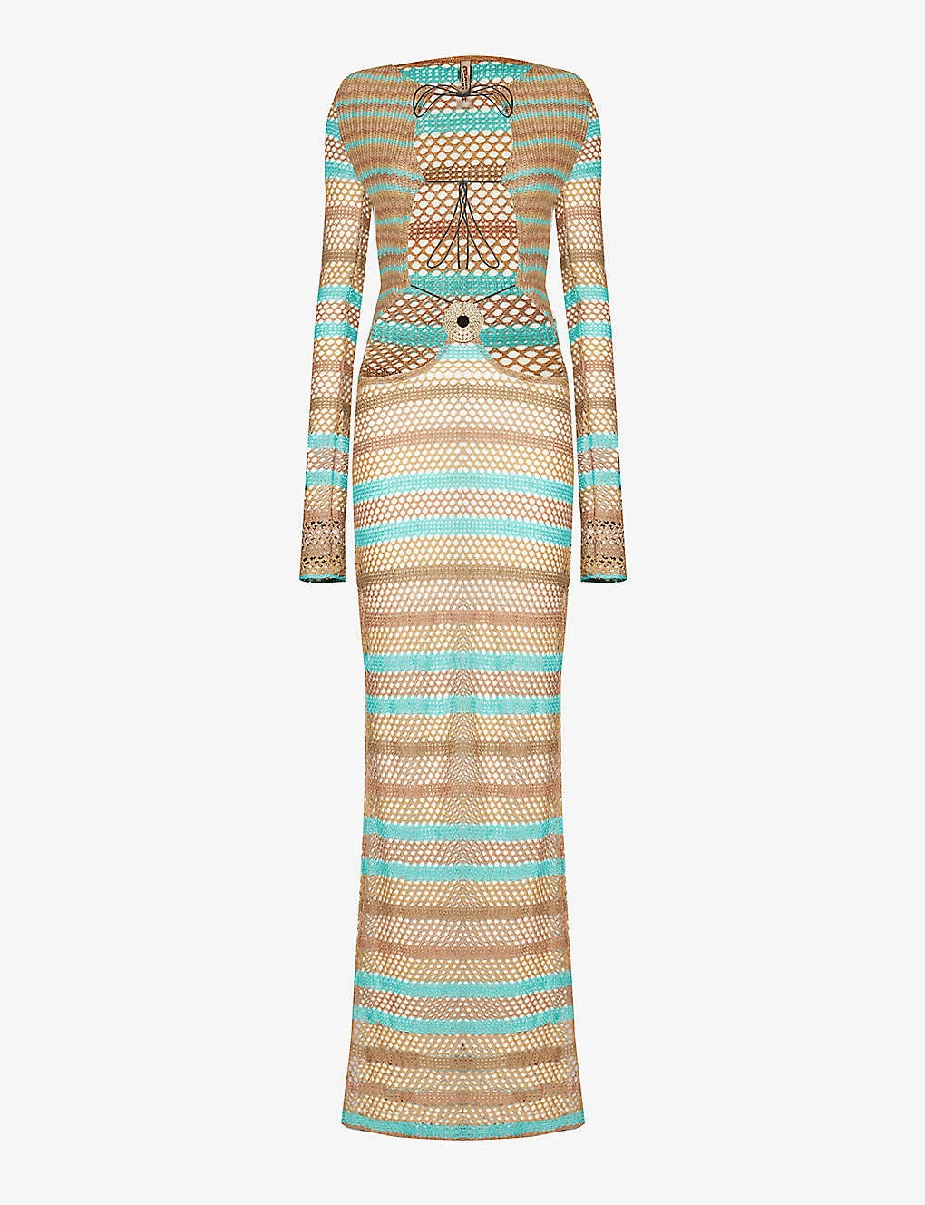 - Slim fit, H-line silhouette, round neck, long sleeves, flared cuffs, cut-out at front, all over crochet pattern, all over striped print, split at side, straight hem