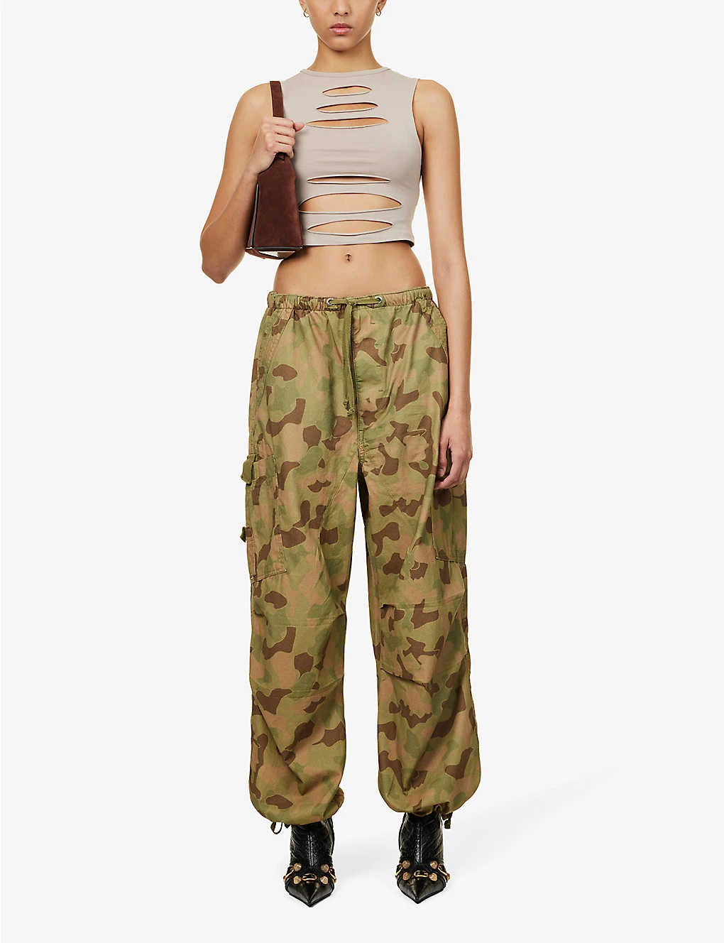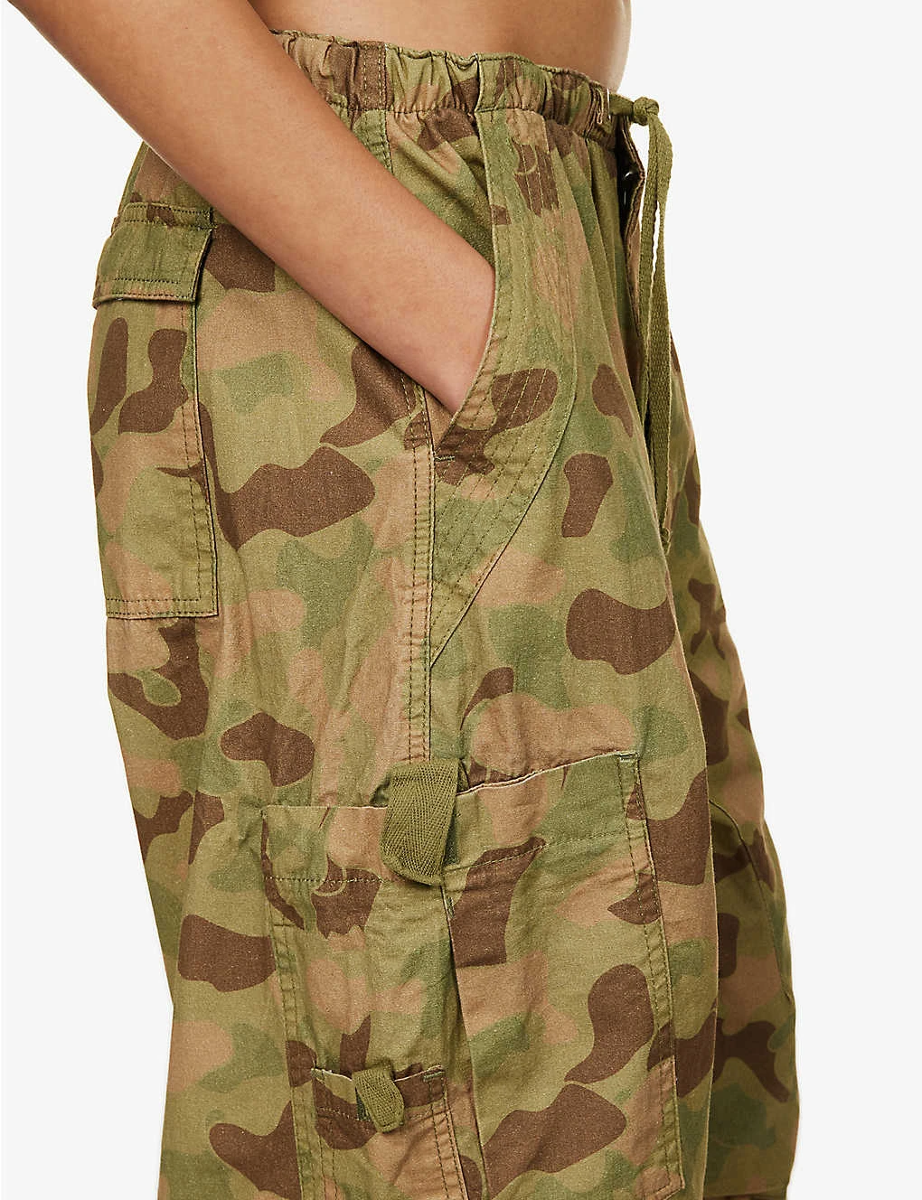 - Oversized fit, low rise, wide leg, drawstring elasticated waistband, two slip pockets at front, patch pockets at sides, darts at back, flap pocket at back, all-over camo pattern, drawstring hems