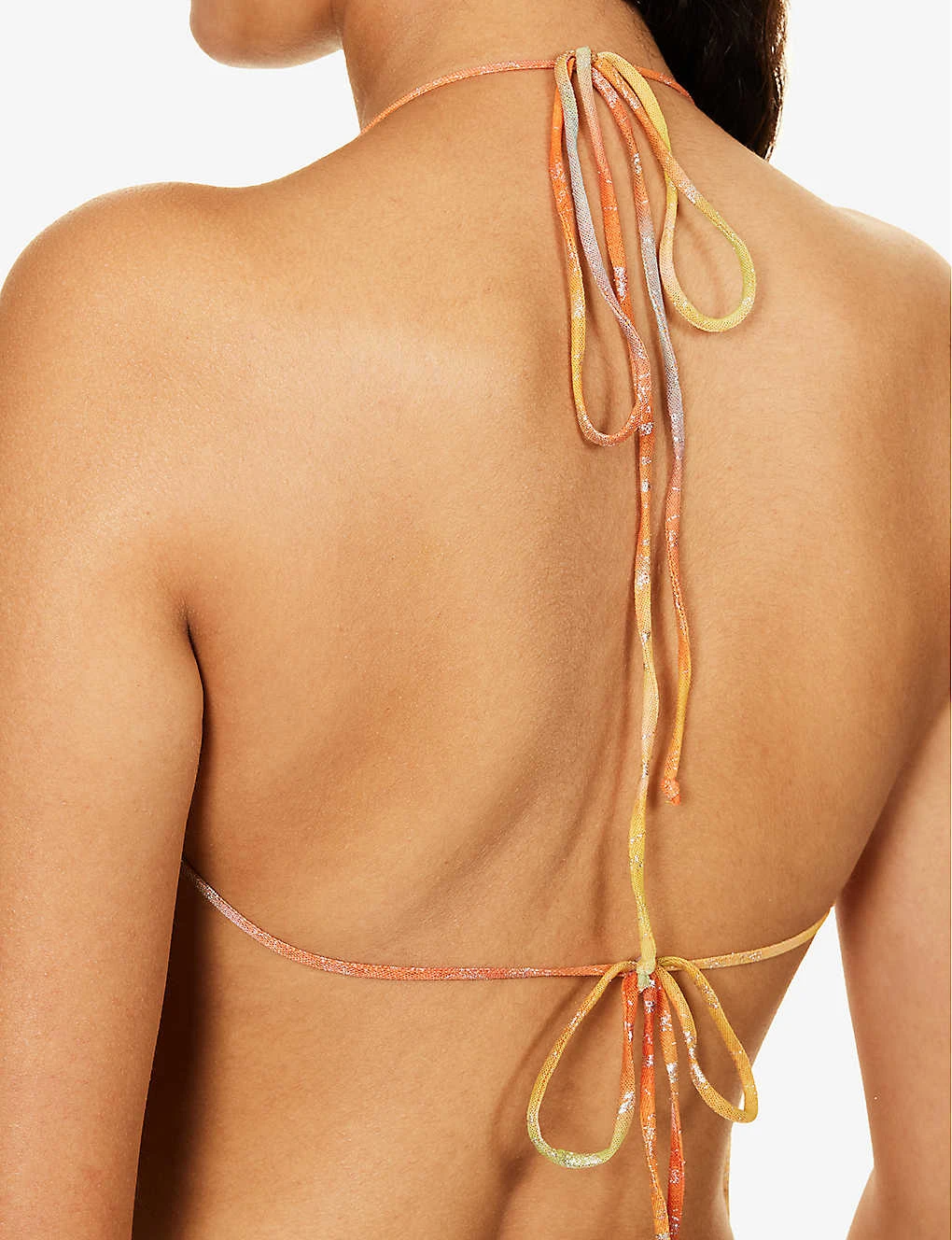 - Fitted. crossover halter-neck, sleeveless, plunging cowl neck, open at back, semi-sheer, all-over metallic print and gradient pattern