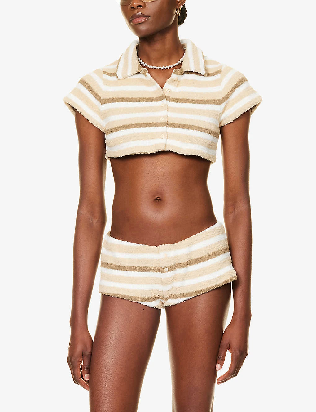 - Regular fit, cropped, spread collar, short sleeves, all over striped print, all over knitted, towelling texture, straight hem