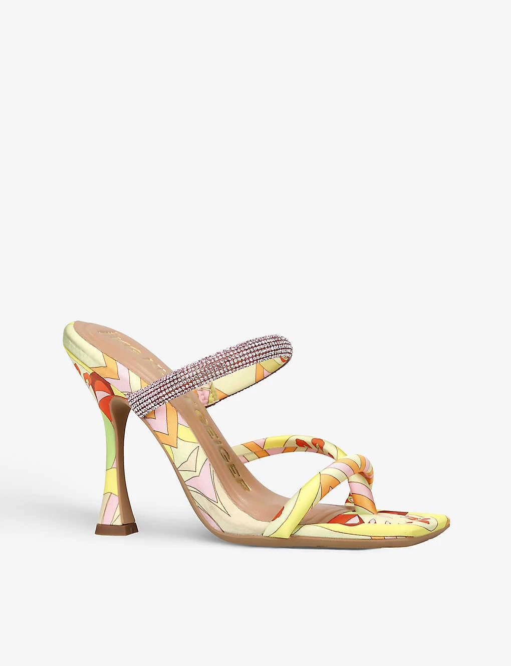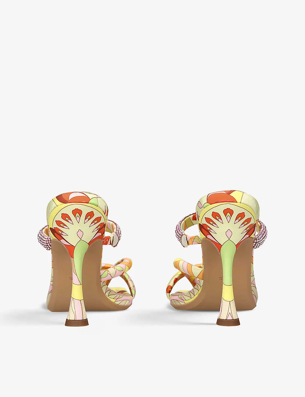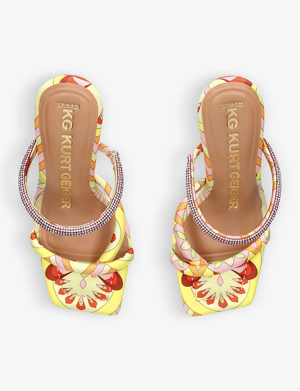 - Open square toe, asymmetric straps at front, one crystal embellished strap at front, padded footbed, curved heel, logo embossed on sole, all-over kaleidoscopic pattern