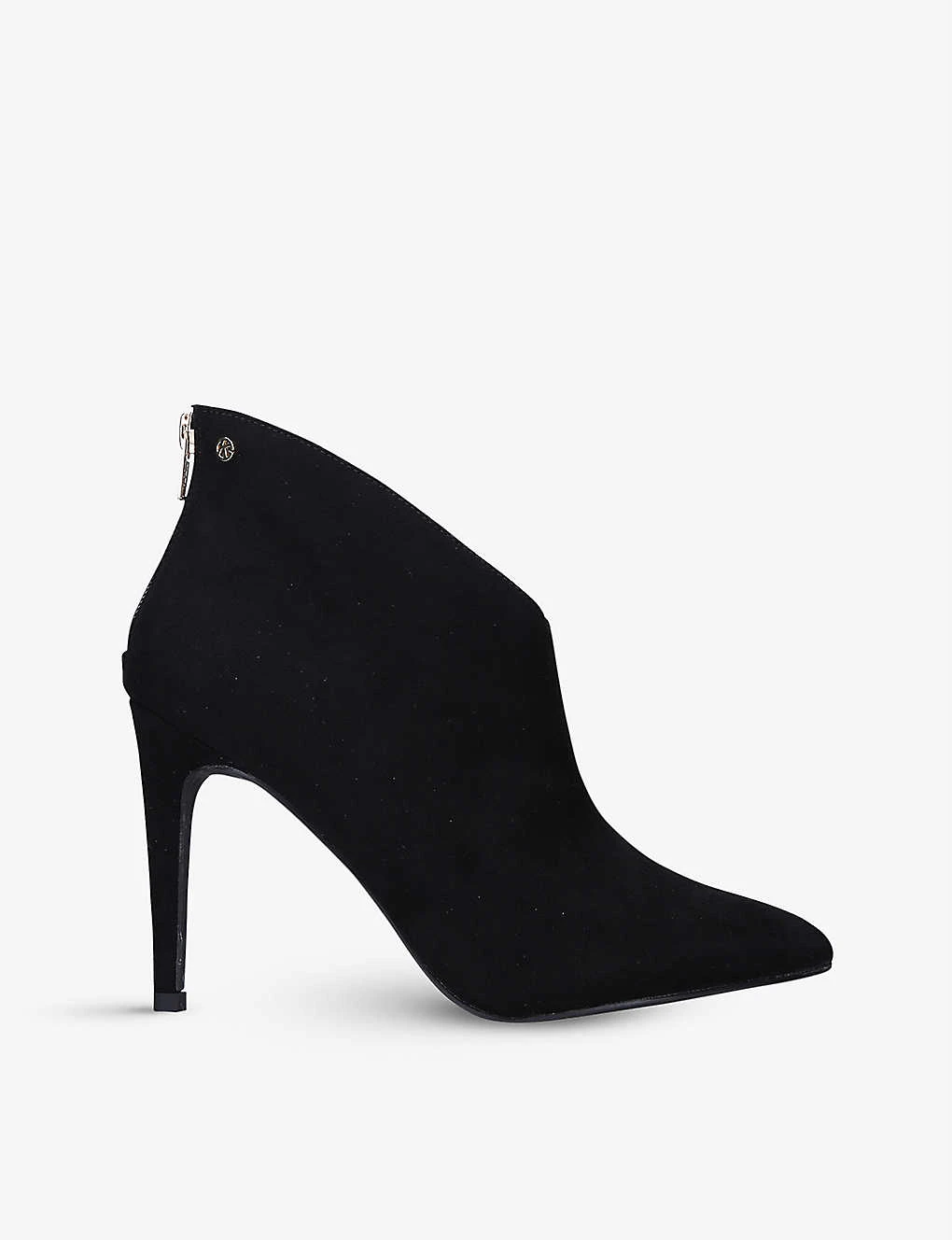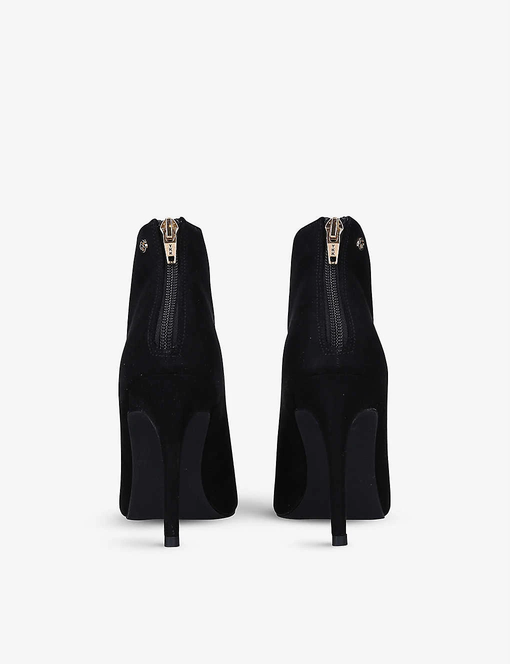 - Pointed toe, curved topline, gold-tone hardware, logo plaque, rear zip, stiletto heel