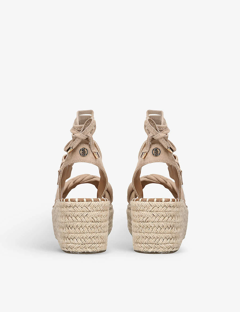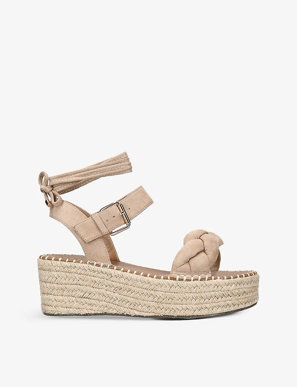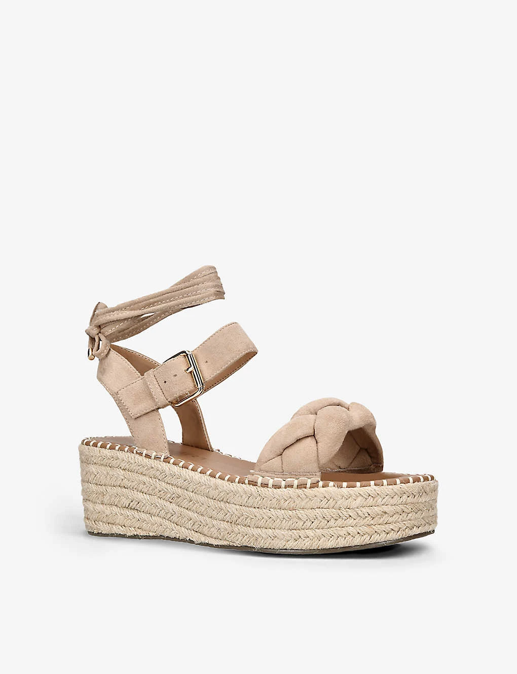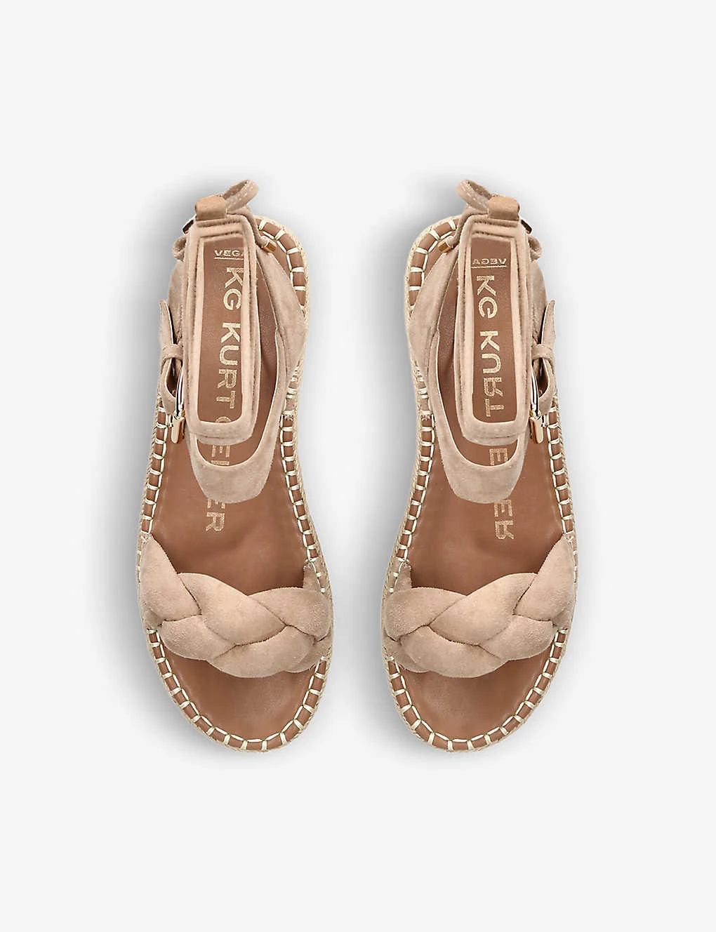 - Round open toe, braided strap at front, initial logo plaque at back, optional wrap around fastening, adjustable buckle fastening, gold-tone hardware, all-over micro suede texture