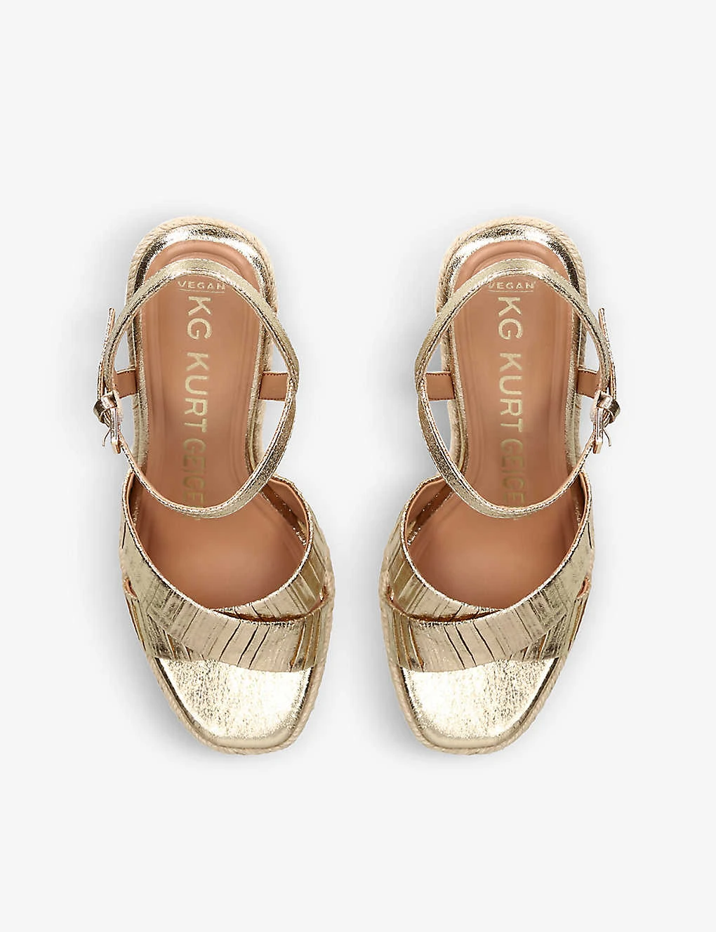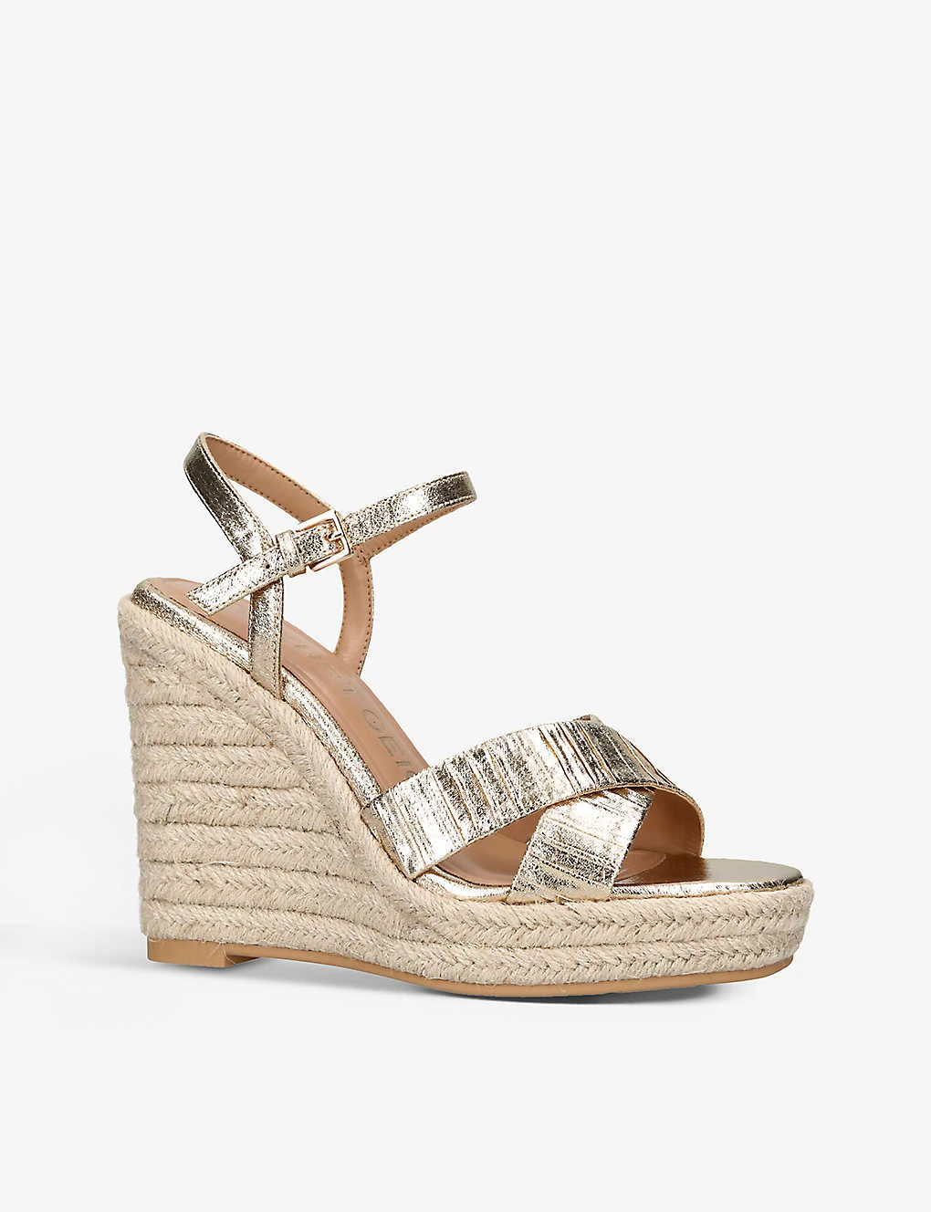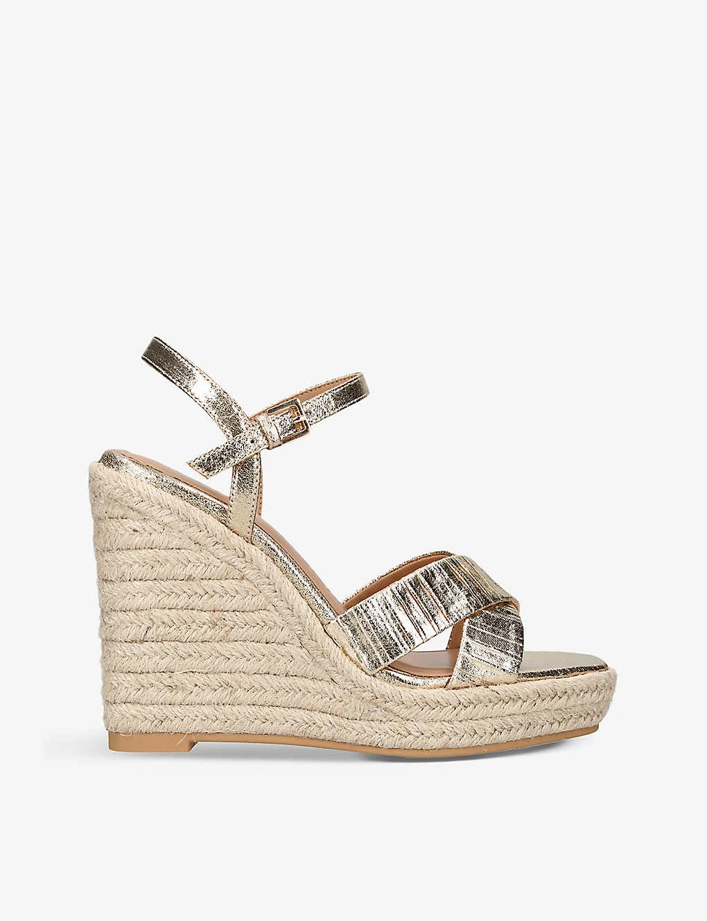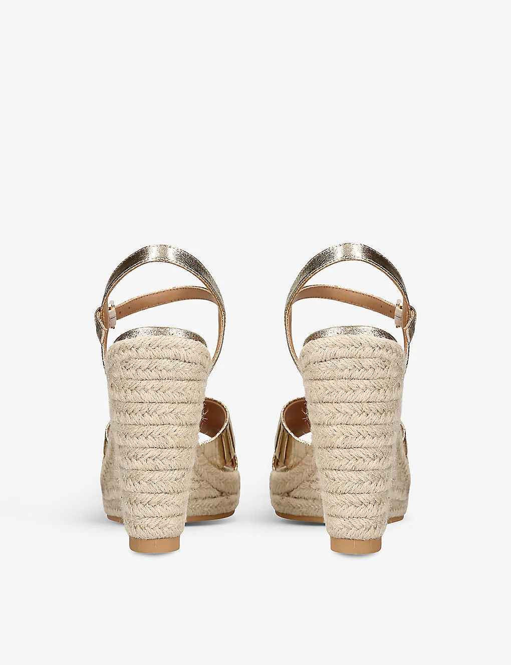 - Open round toe, adjustable ankle strap, front cross strap, all-over metallic effect, all-over rope weave on heel, wedge heel, gold tone hardware