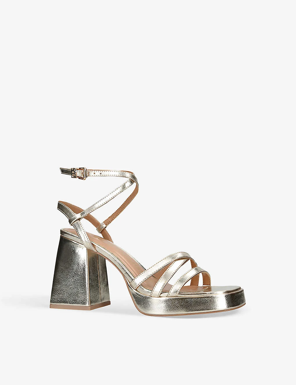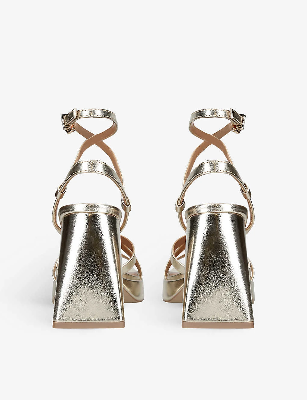 - Open square round toe, cross-over ankle straps, adjustable buckle fastening, block heel, all-over metallic finish