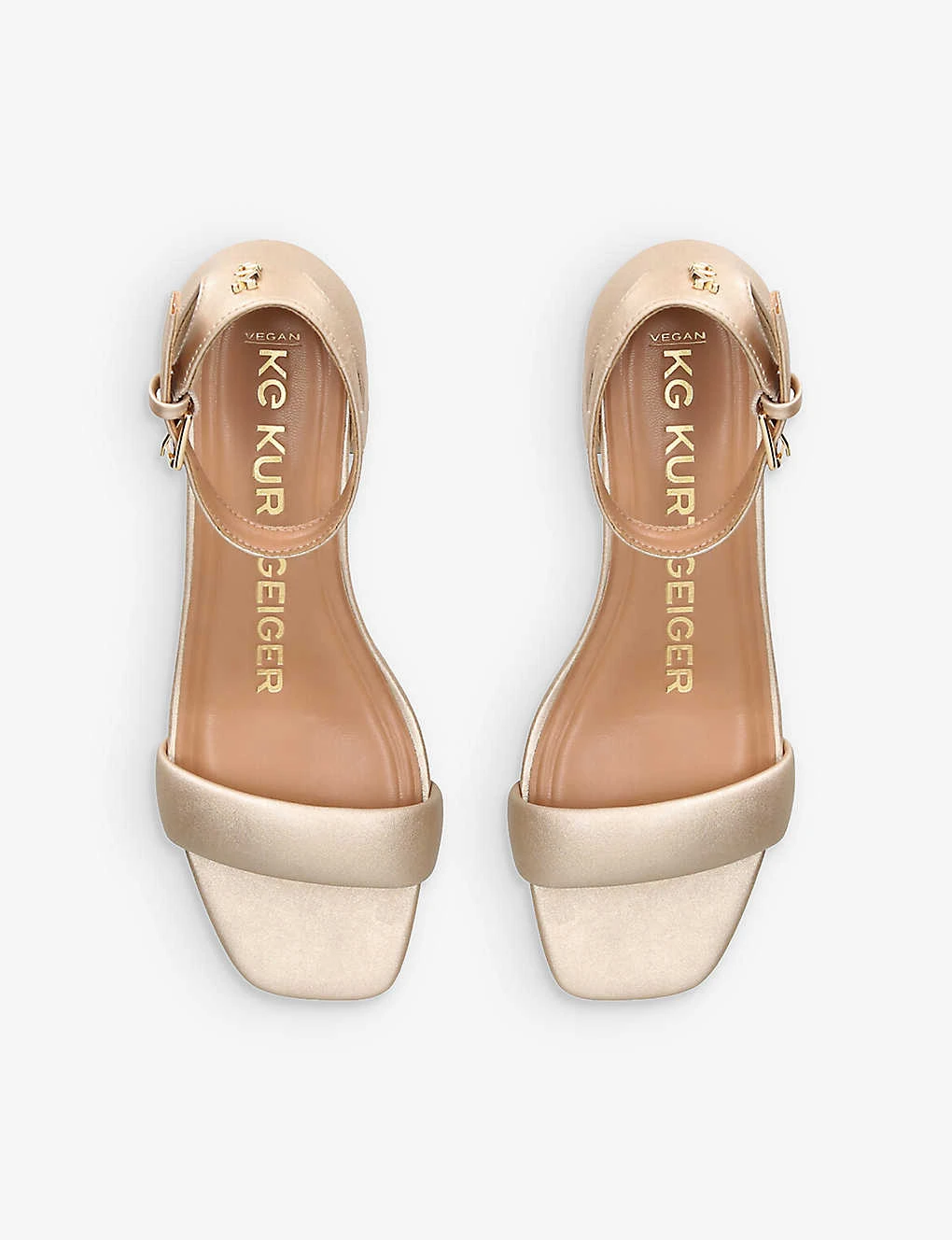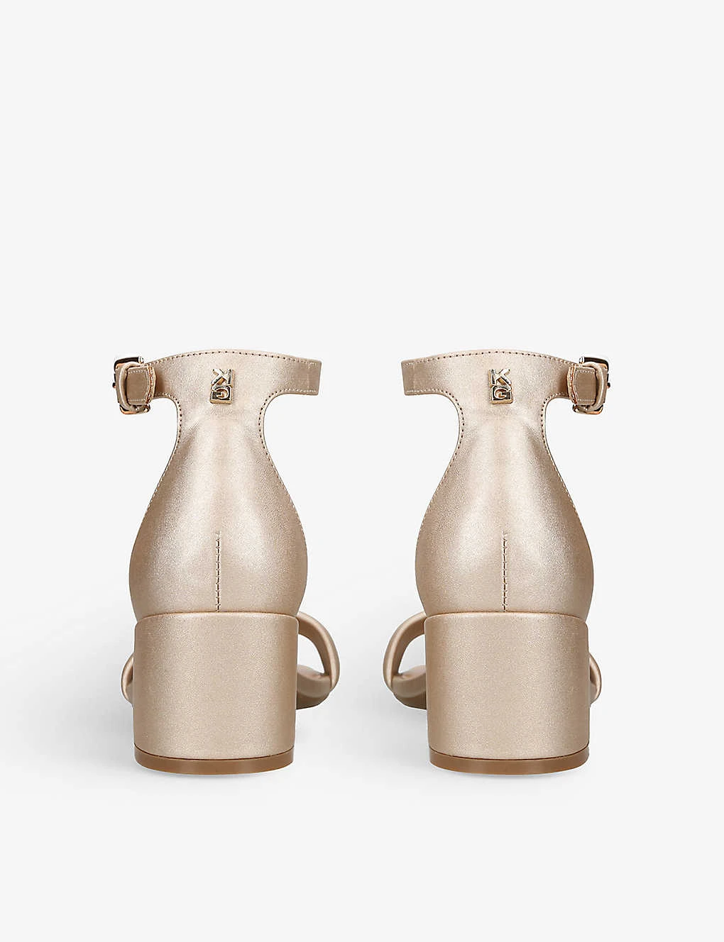 - Open square toe, adjustable ankle strap, branded hardware on zip, one strap at front, printed logo on footed, gold-tone hardware, block heel