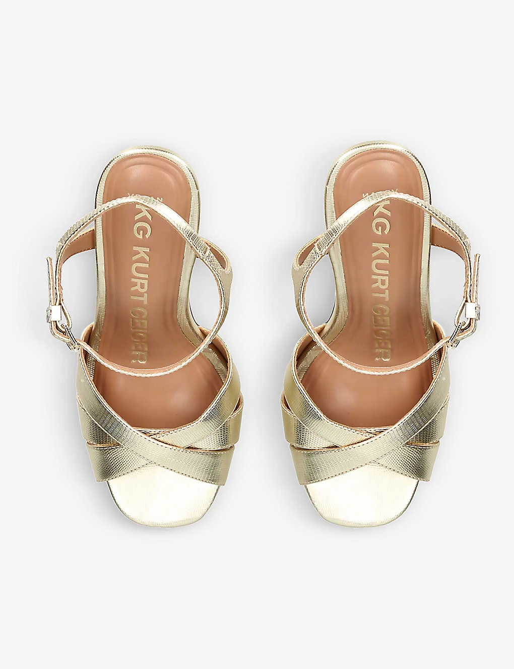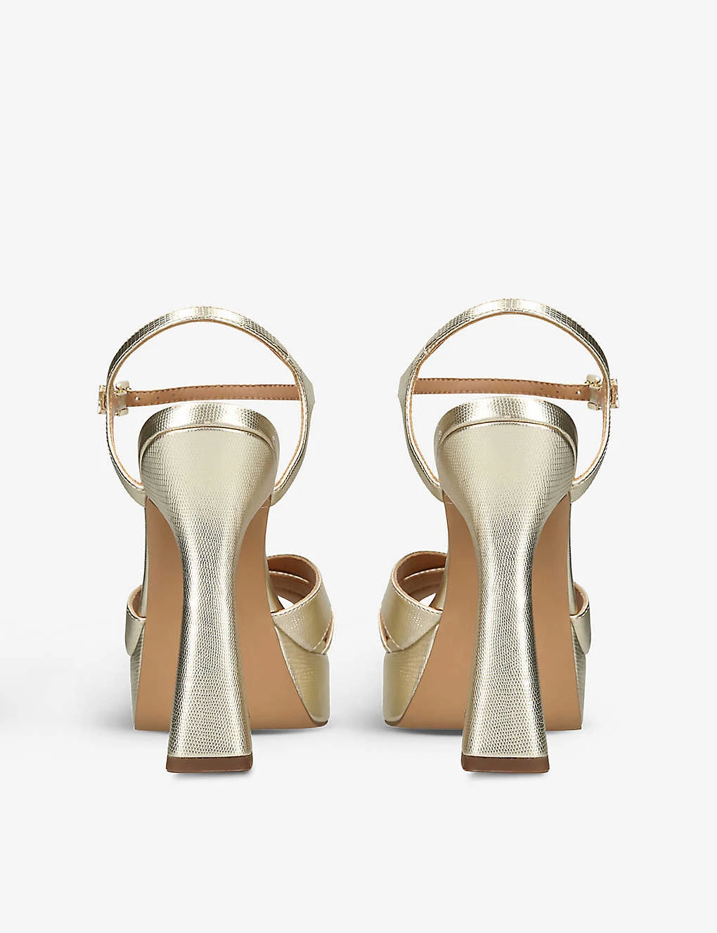 - Open round toe, adjustable ankle strap, branded placket on buckle, cross strap design at front, all-over snake-embossed effect, gold tone hardware, block heel