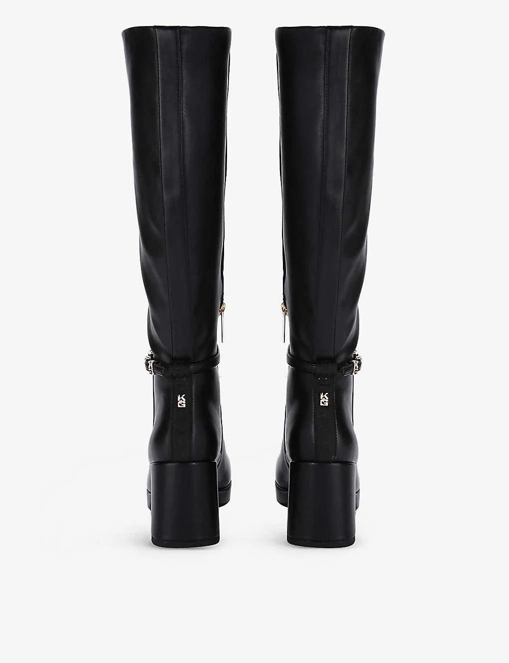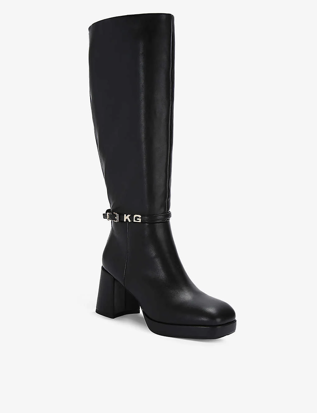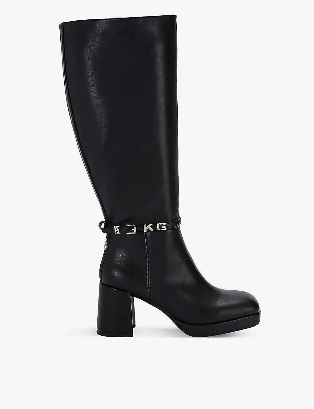 - Knee high, closed round toe, branded hardware at back heel, branded buckle at ankle, gold-tone hardware