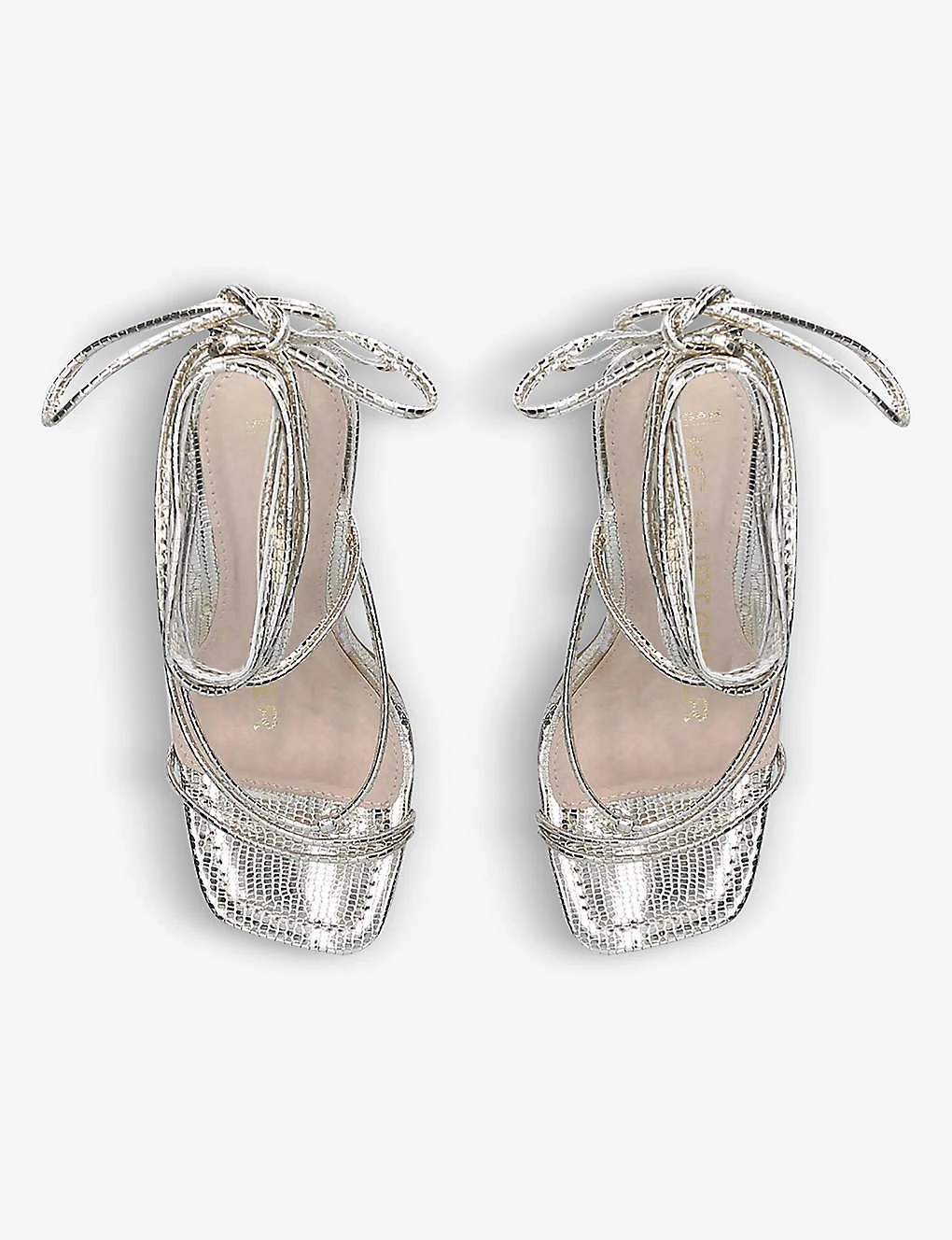 - Square toe, stiletto heel, snakeskin print finish, ankle strap detail