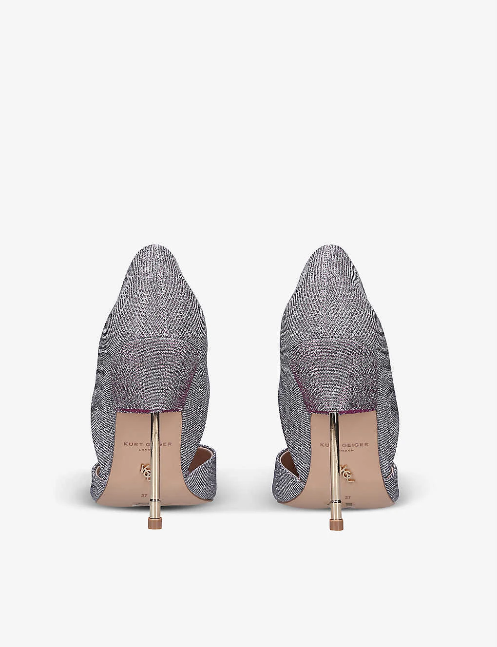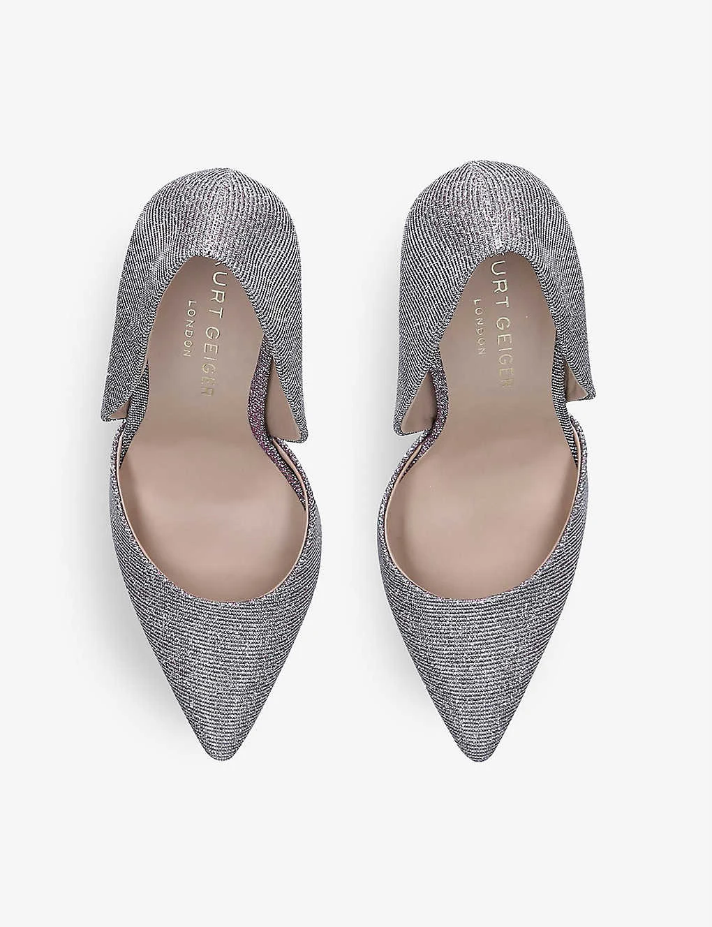 - Pointed toe, all-over textured, glittered finish, d’Orsay cut-out style, gold-toned metal stiletto heel