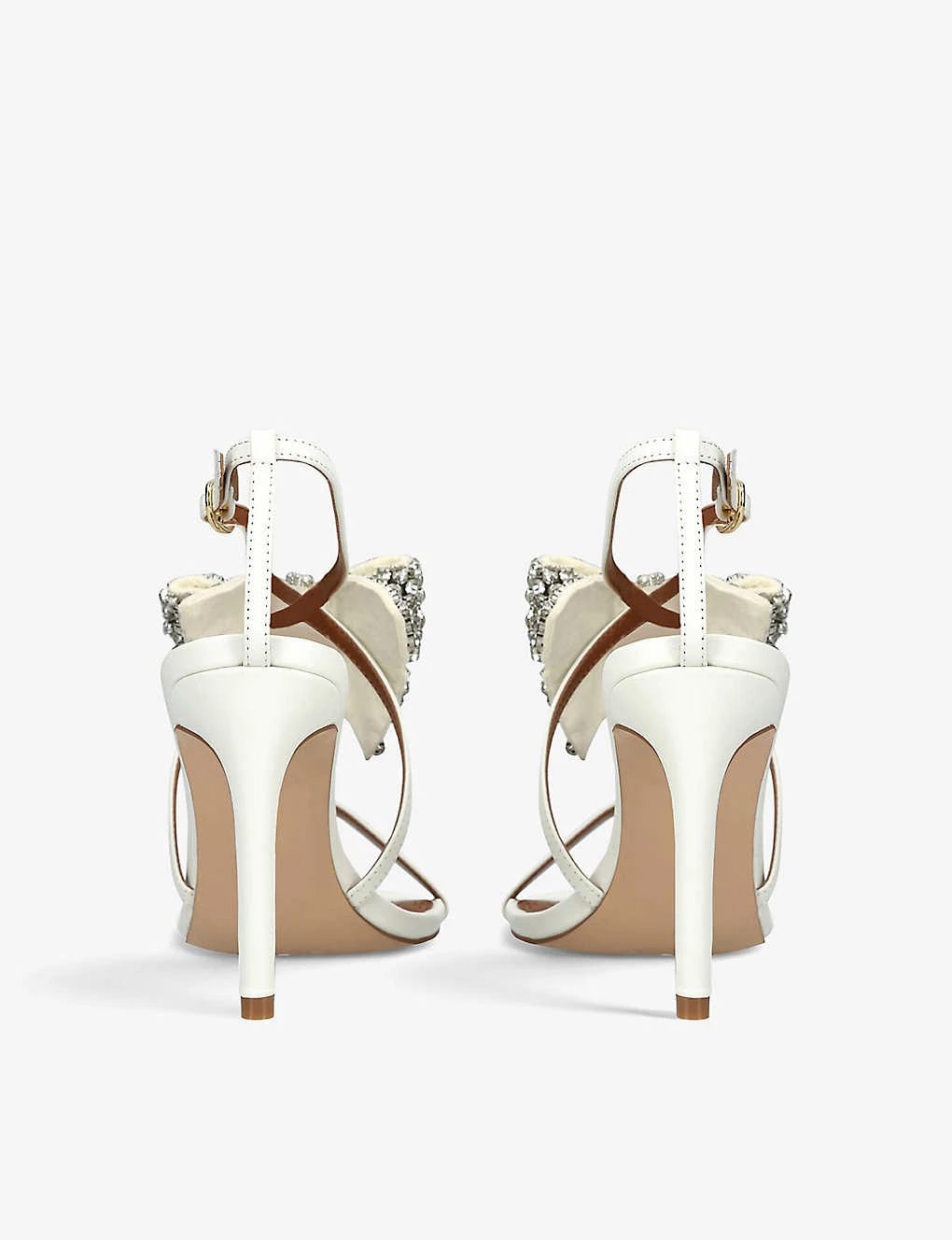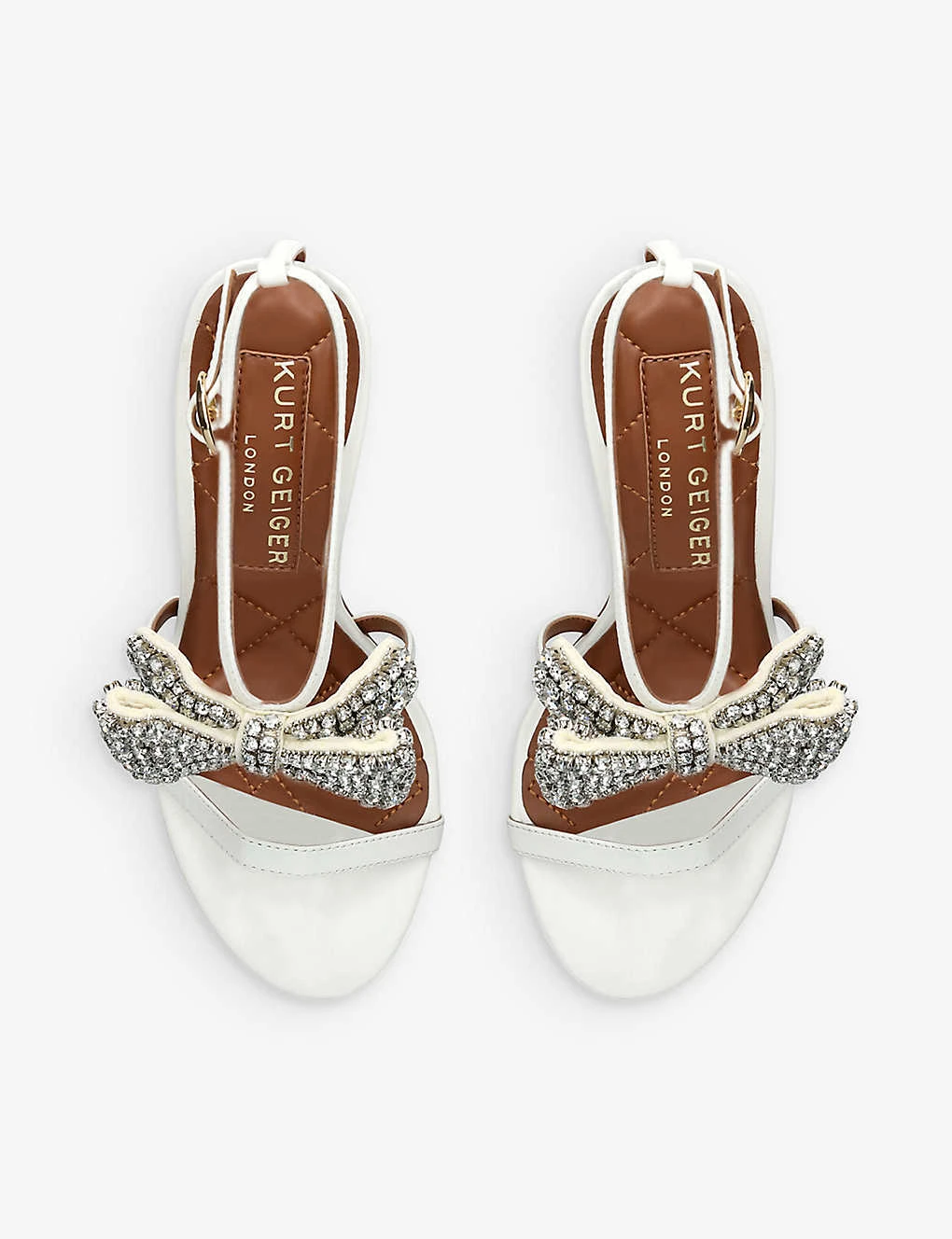 - Open toe, adjustable strap, crystal-embellished bow motif on front, stiletto heel, branded insole, padded footbed, gold-tone KG stud on the outer sole