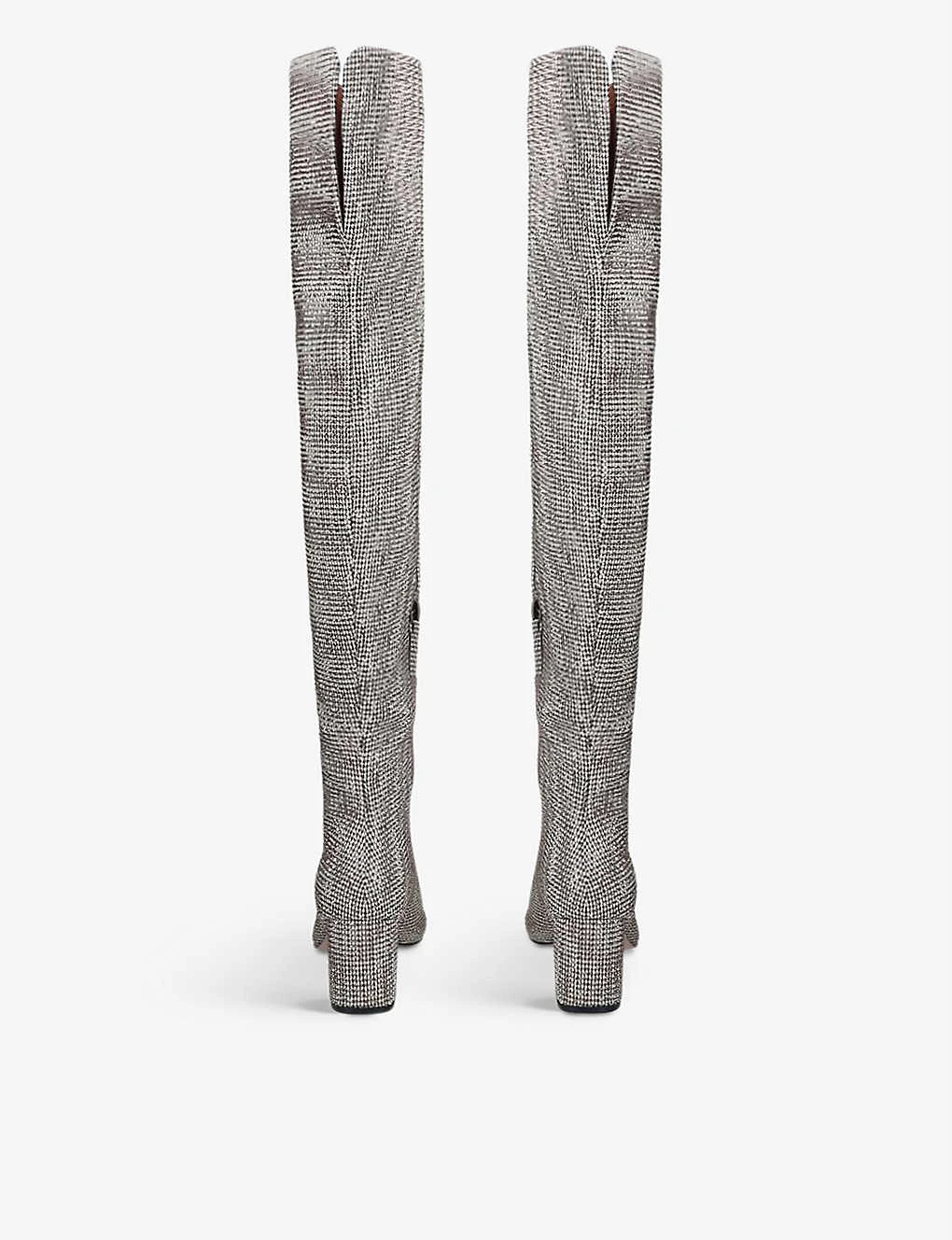 - Almond toe, all-over crystal embellishments, over-the-knee cuff, split at back cuff, chunky heel