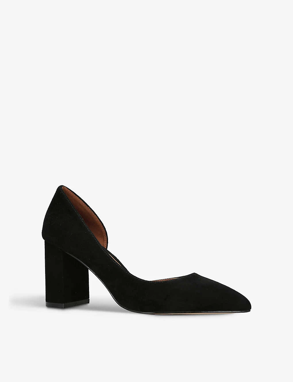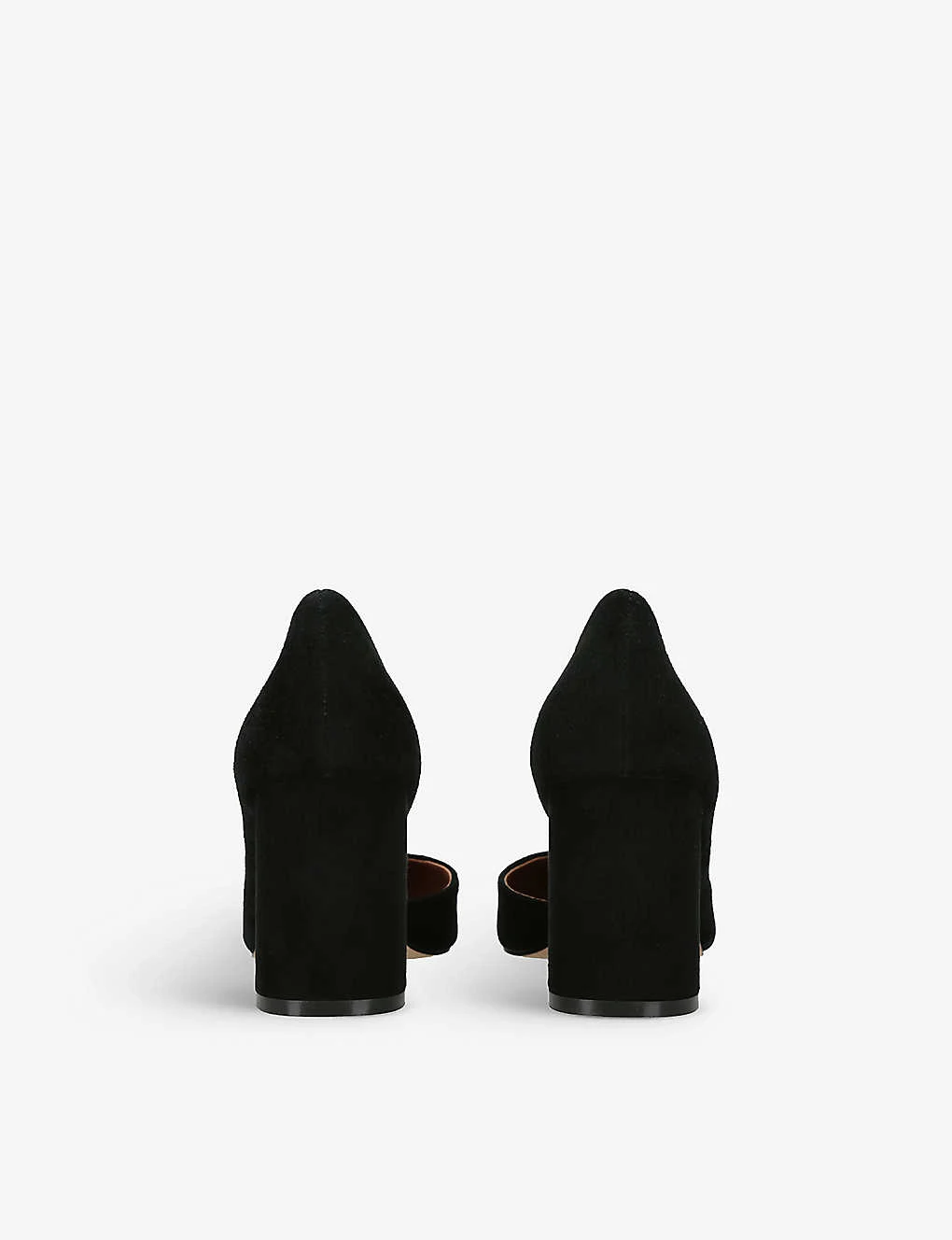 - Pointed closed toe, cut-out at inner side, printed logo on footbed, logo stud on the outer sole, block heel