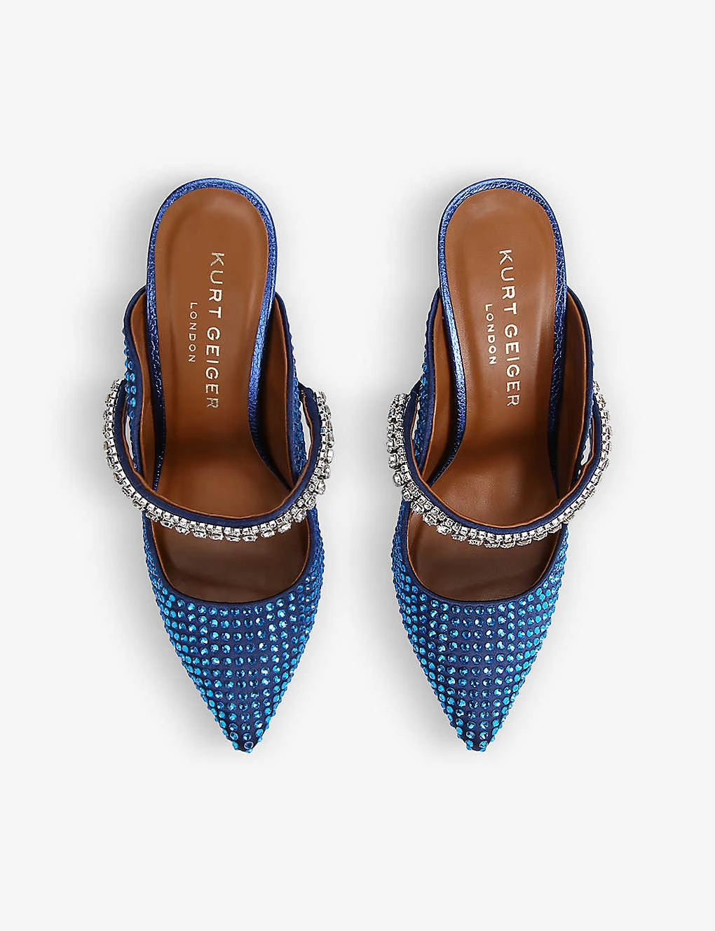 - Pointed toe, all-over crystal embellishments, single front strap, backless, stiletto heel