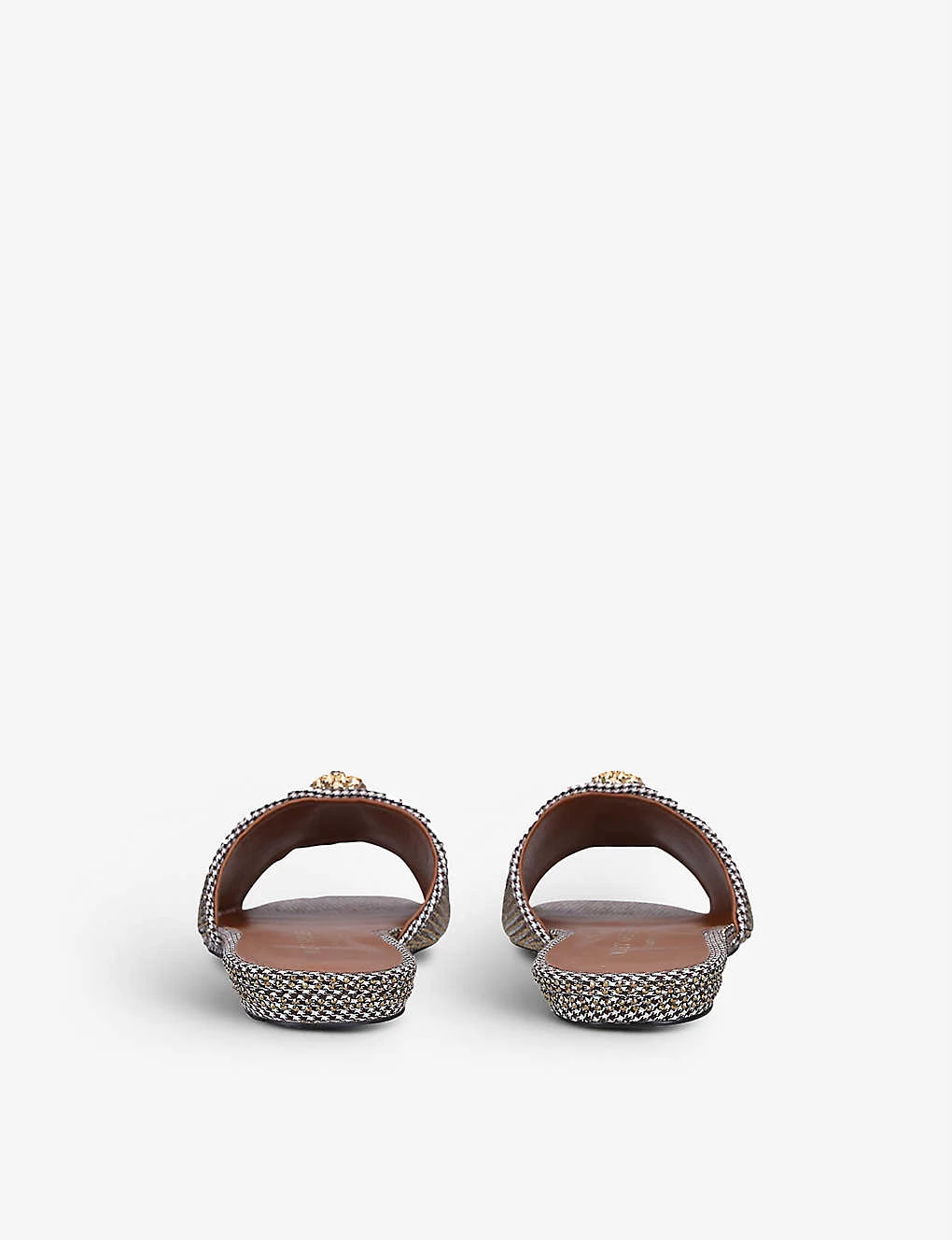 - Square open toe, backless, all-over houndstooth print, all-over gold-tone gem embellishments, wide toe strap, encrusted gold-tone eagle head embellishment at front, flat