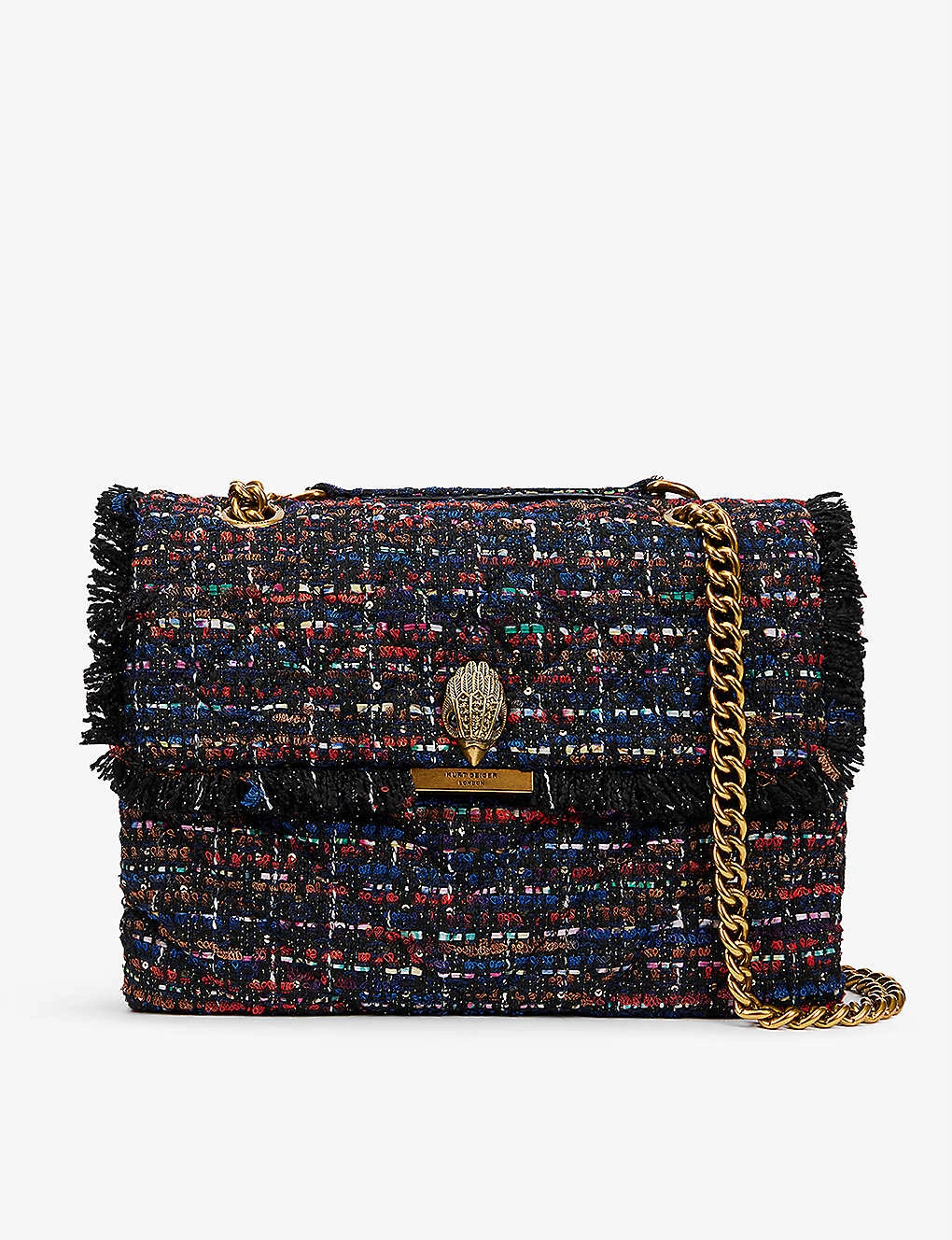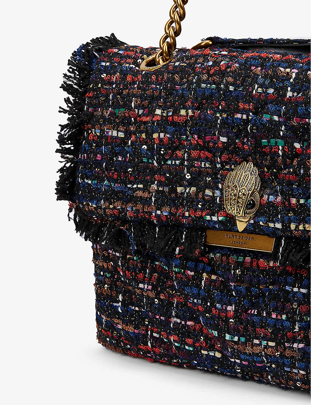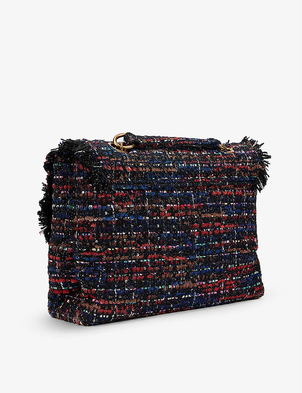 Rectangular shape, double chain link strap, graphic design plaque at flap front, all over tweed pattern, fringed trims, gold-toned hardware, two main compartments, internal slip pocket and brand patch, fully lined