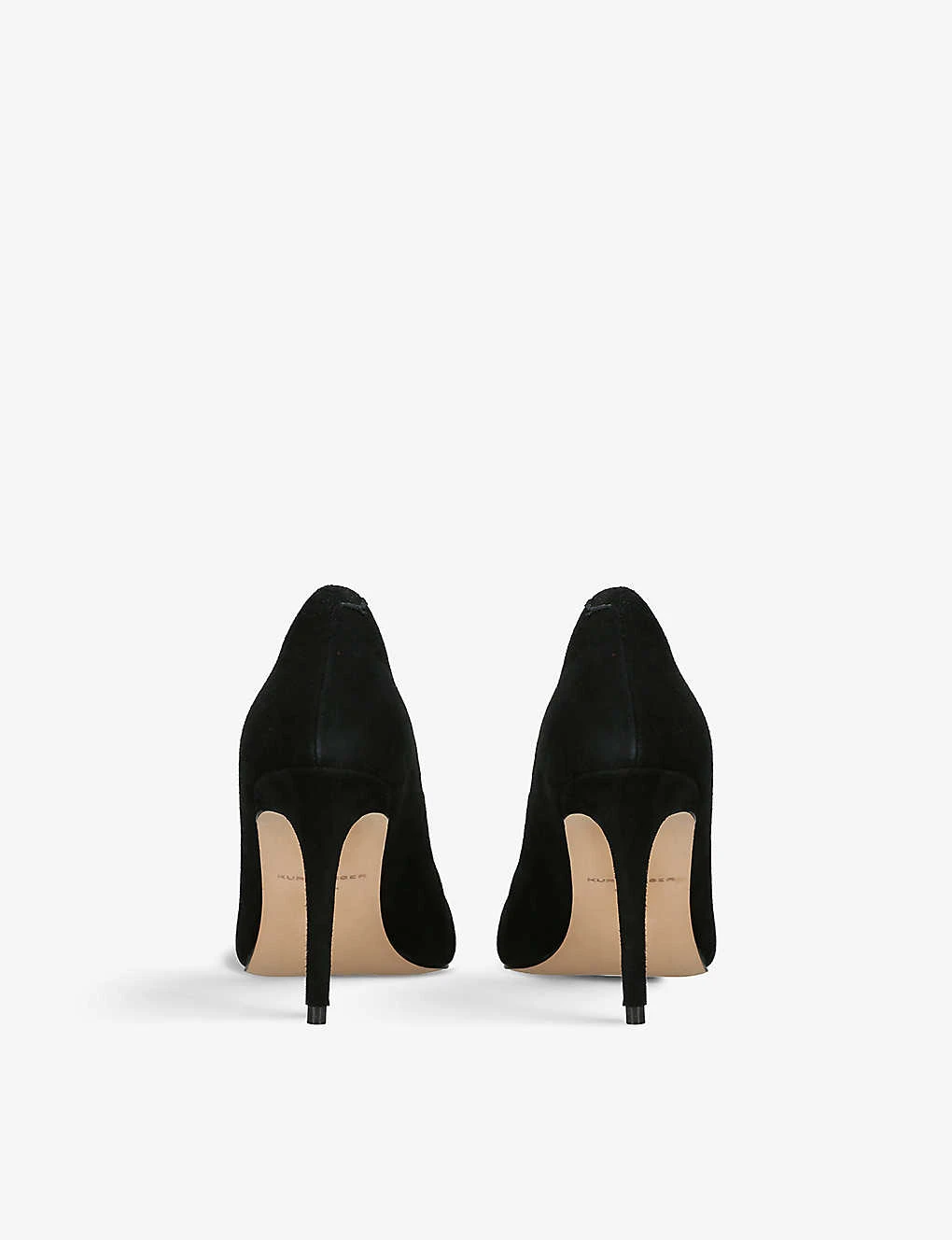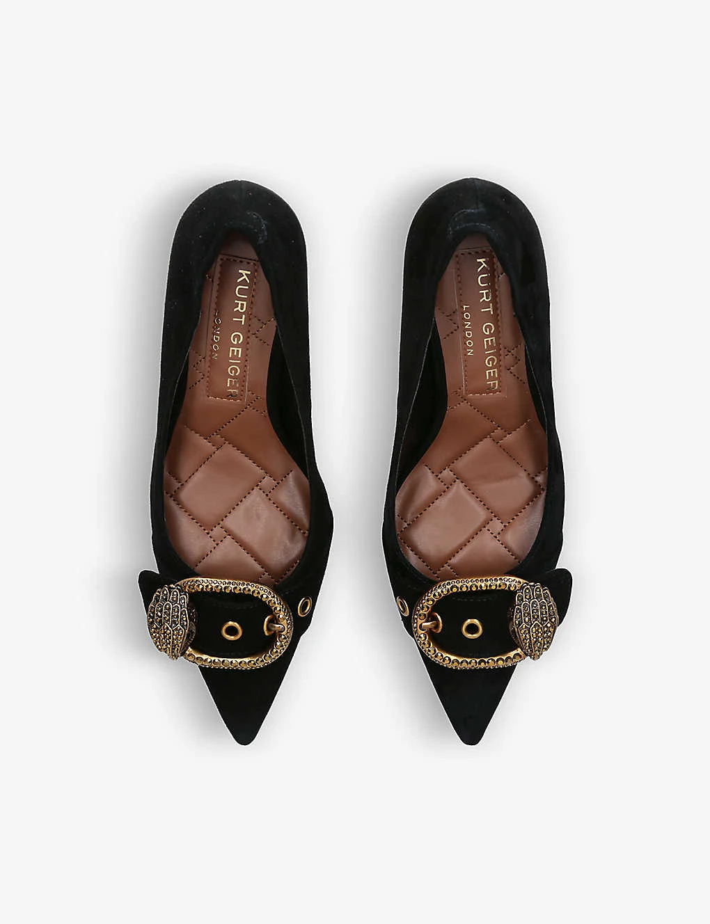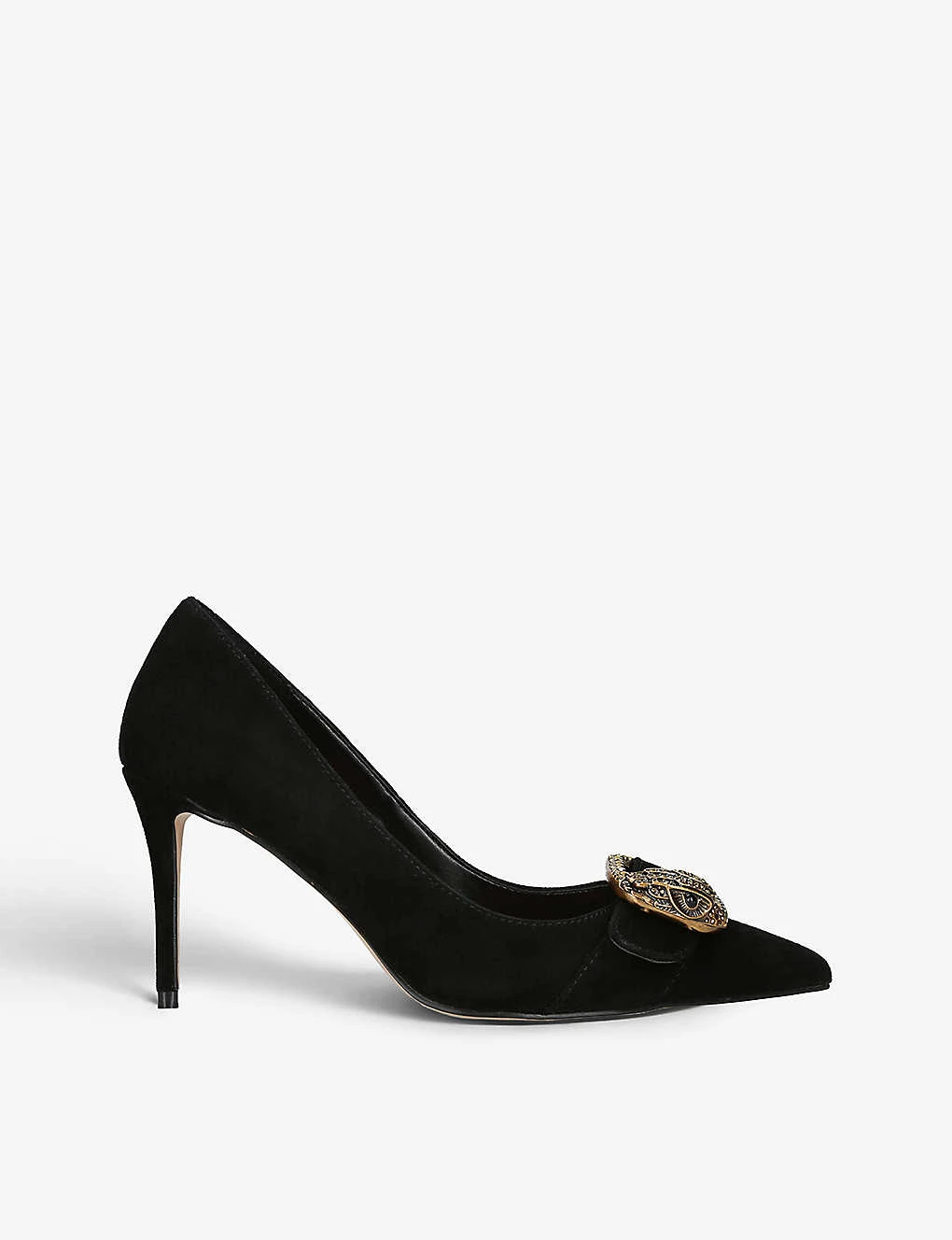 - Pointed closed toe, buckle and eagle-head enfeeblement at front, printed logo at footbed, stiletto heel, gold-tone hardware