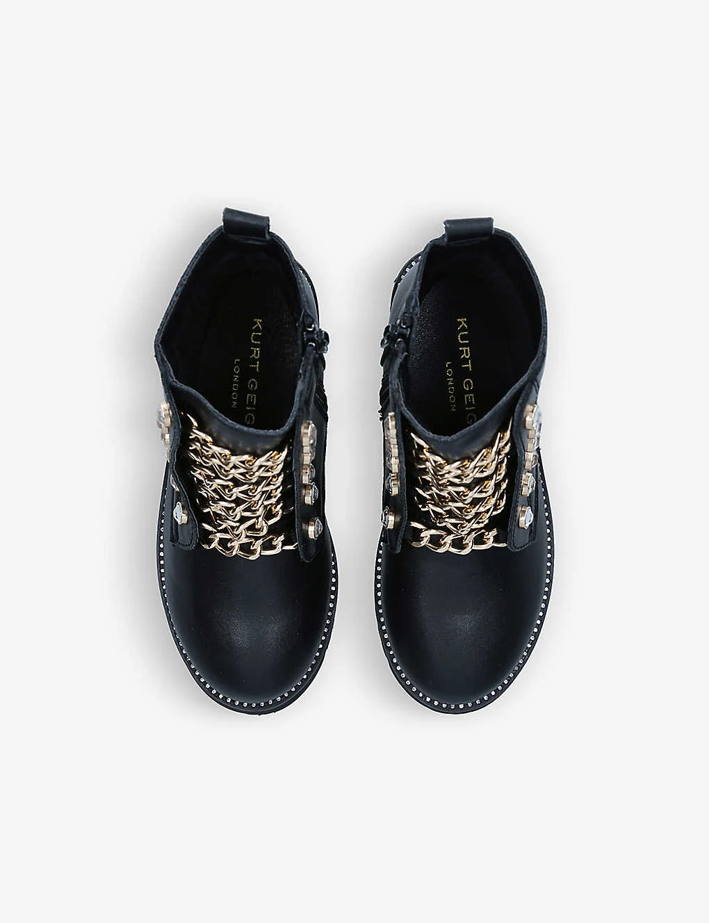 - Round toe, chunky sole, chain detail, gold-tone hardware
