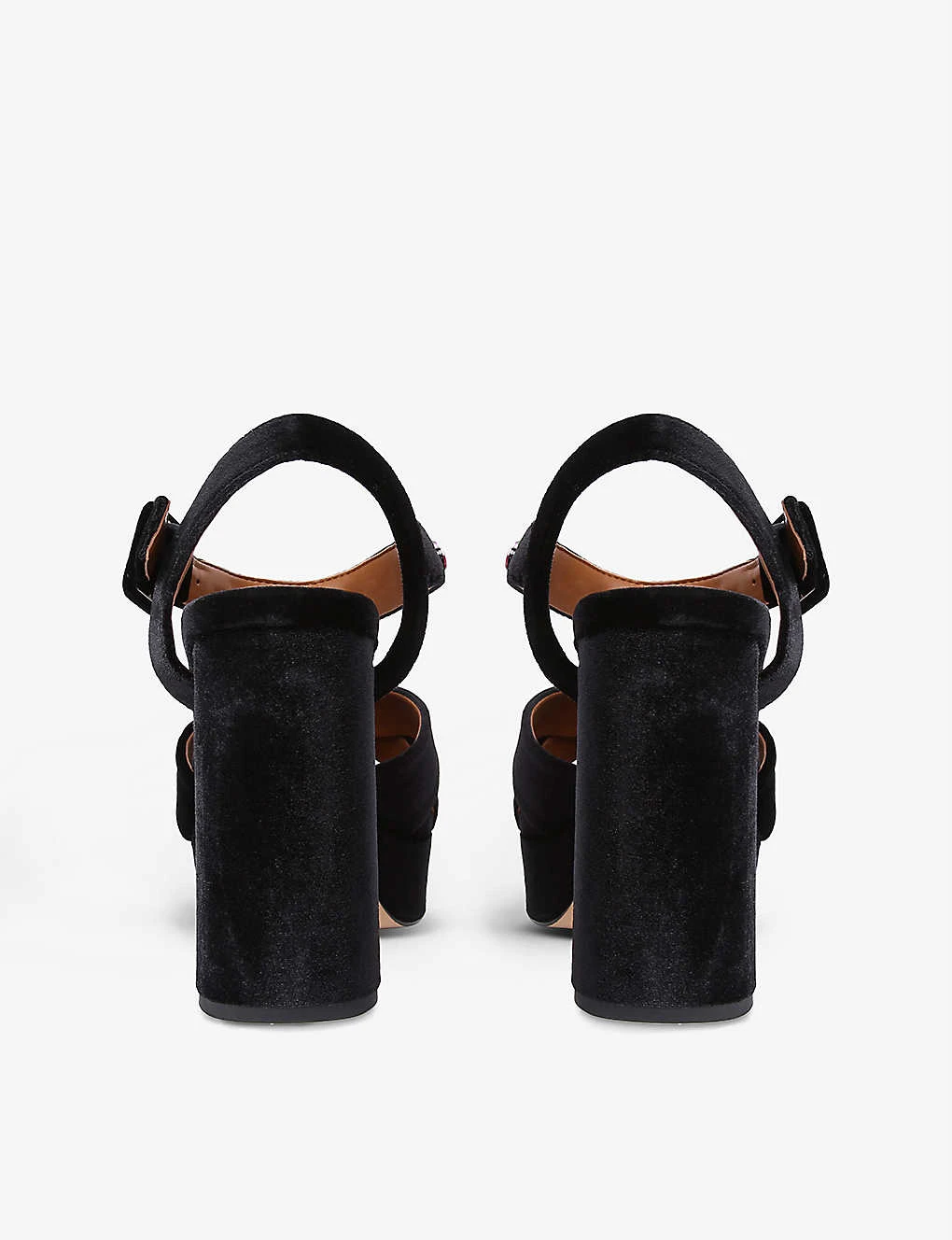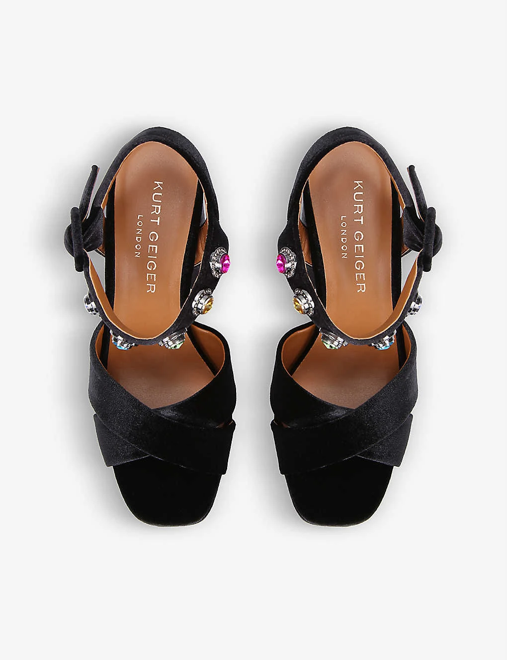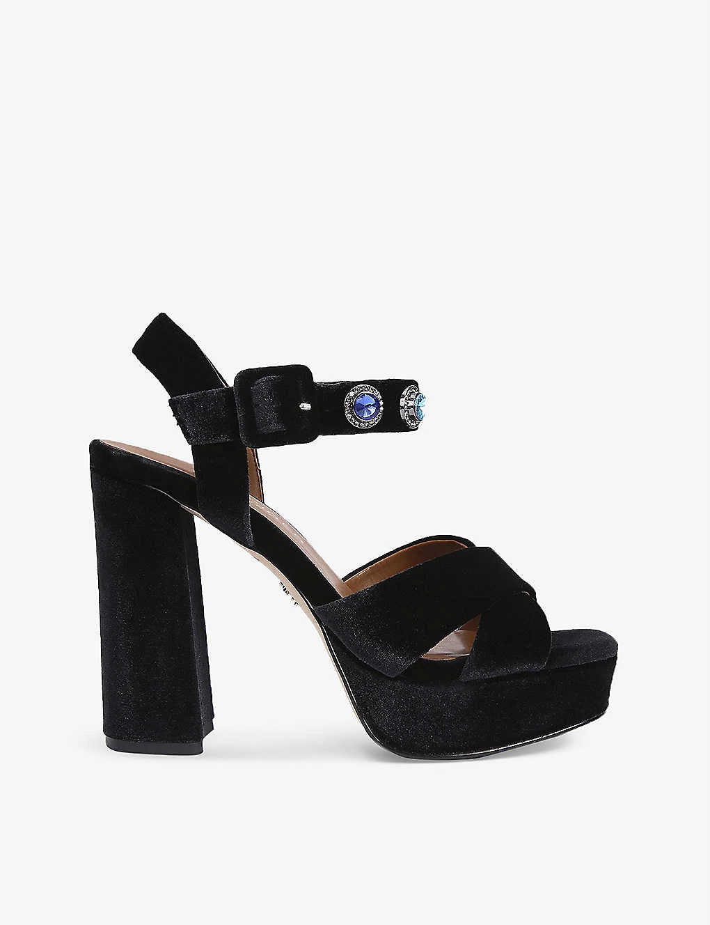 - Open toe, crossover straps, rhinestone embellishment, platform soles, chunky heels
