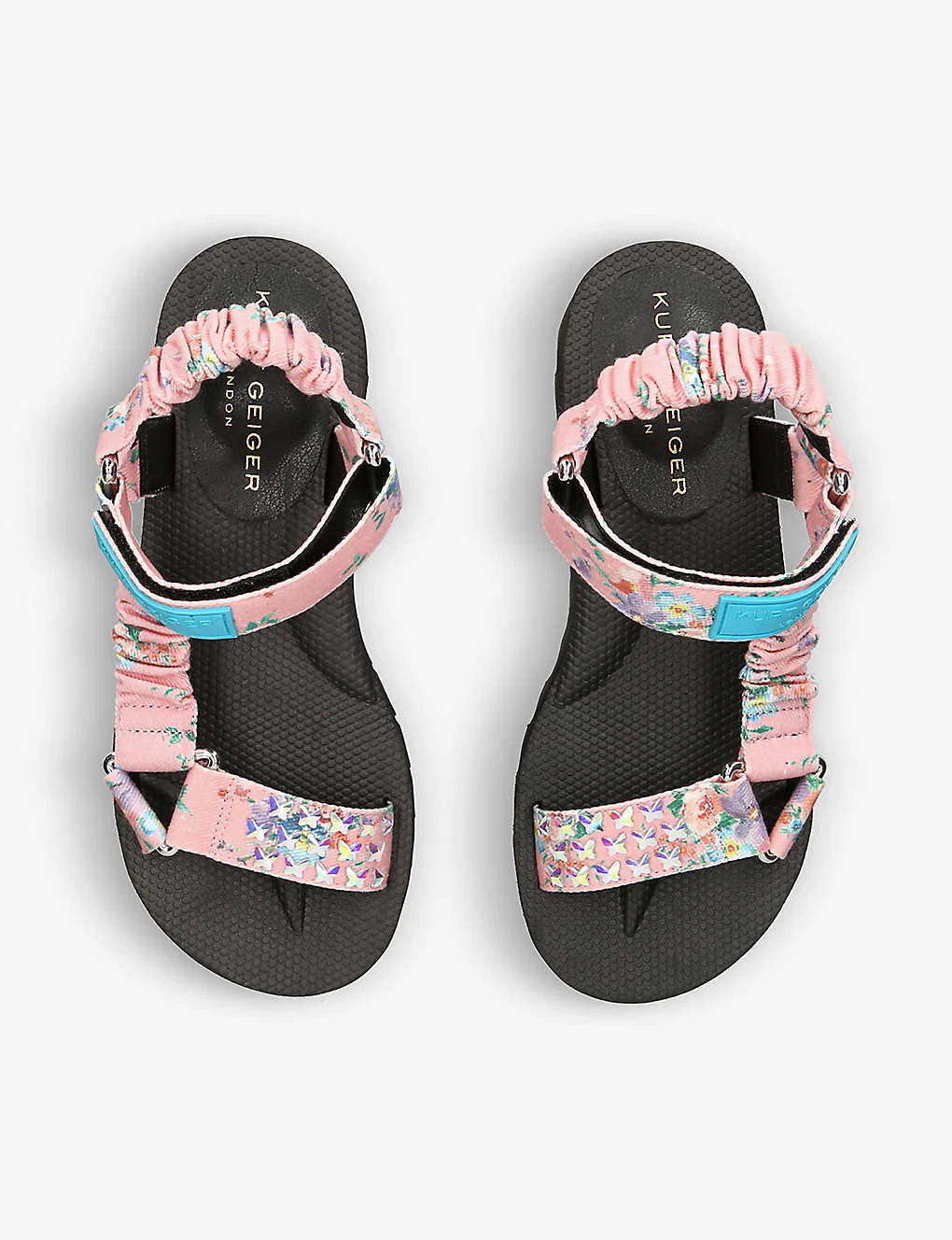 - Open round toe, ruched straps, branded logo-patch at front, butterfly-shaped crystal embellishment on front strap, all-over floral print, track style sole