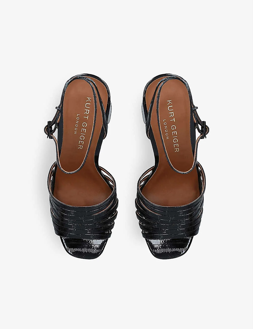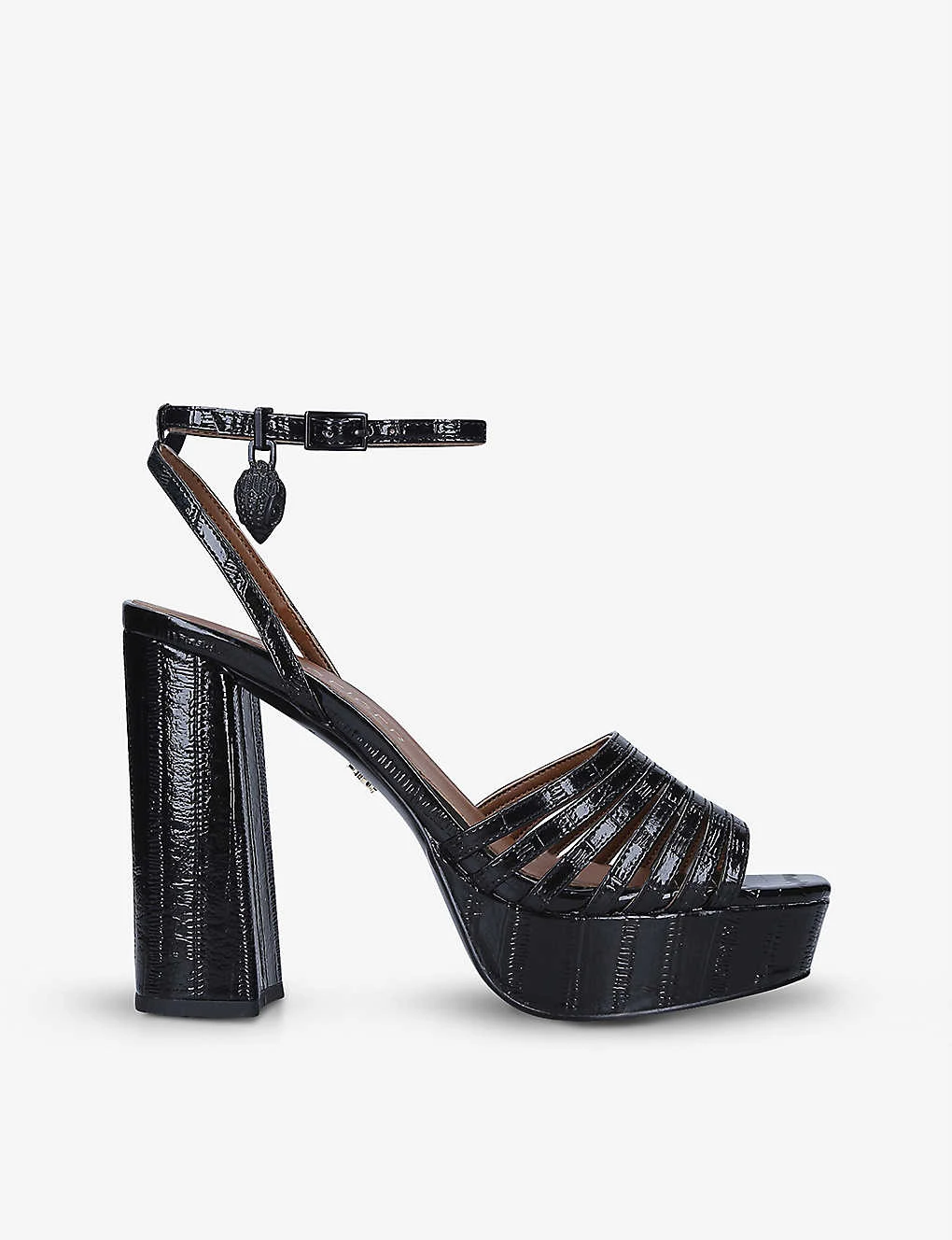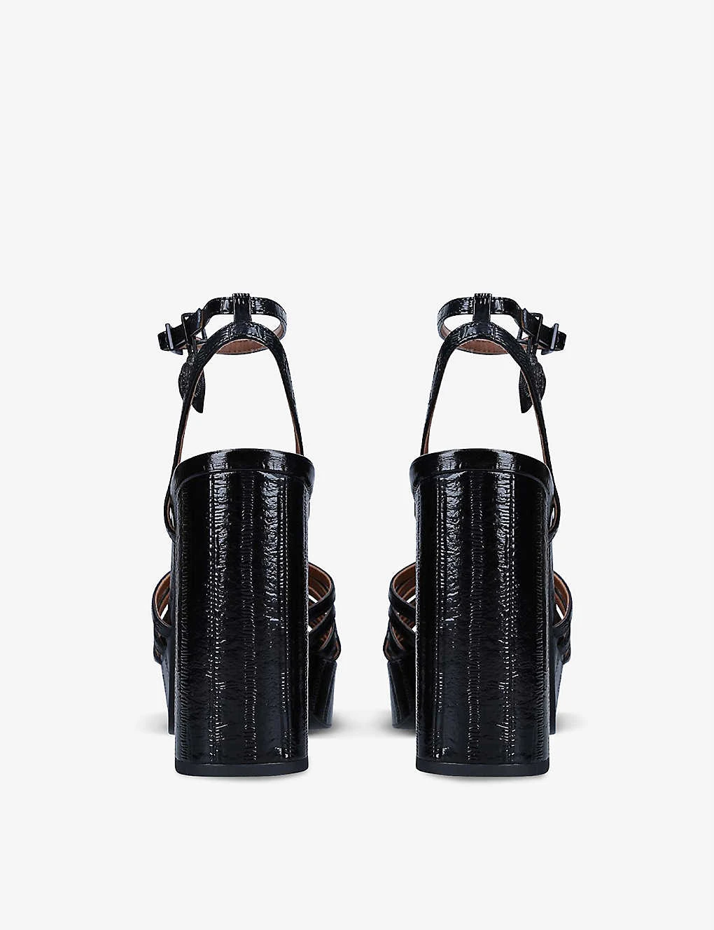 Multiple straps, patent finish, open toe, eagle head embellishment at the buckle, platform sole, block heel
