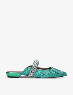 - Pointed toe, backless, all-over crystal embellishment, front strap