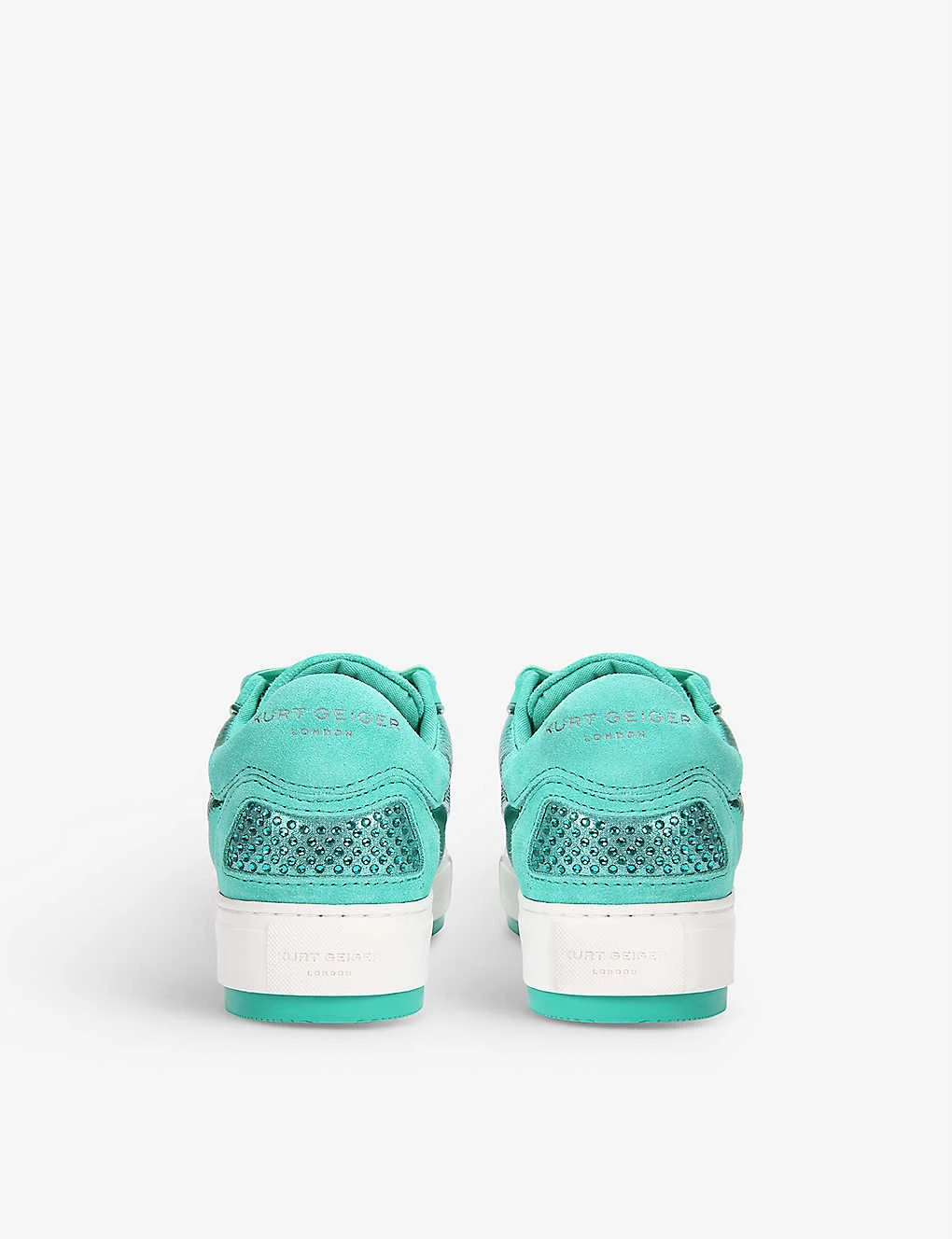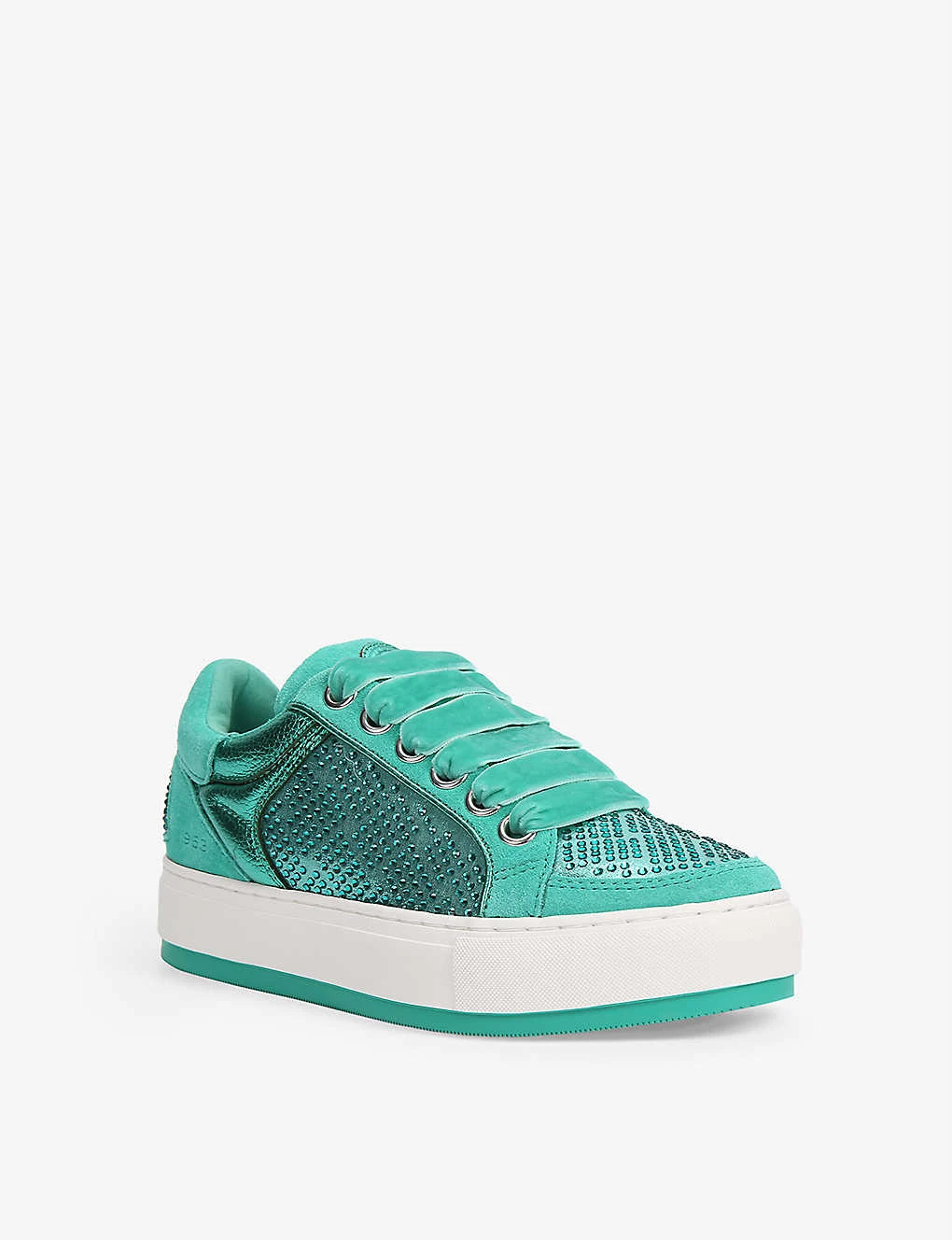 - Round toe, chunky laces, panelled construction, metallic trims, crystal embellishments, embossed logo at the heel