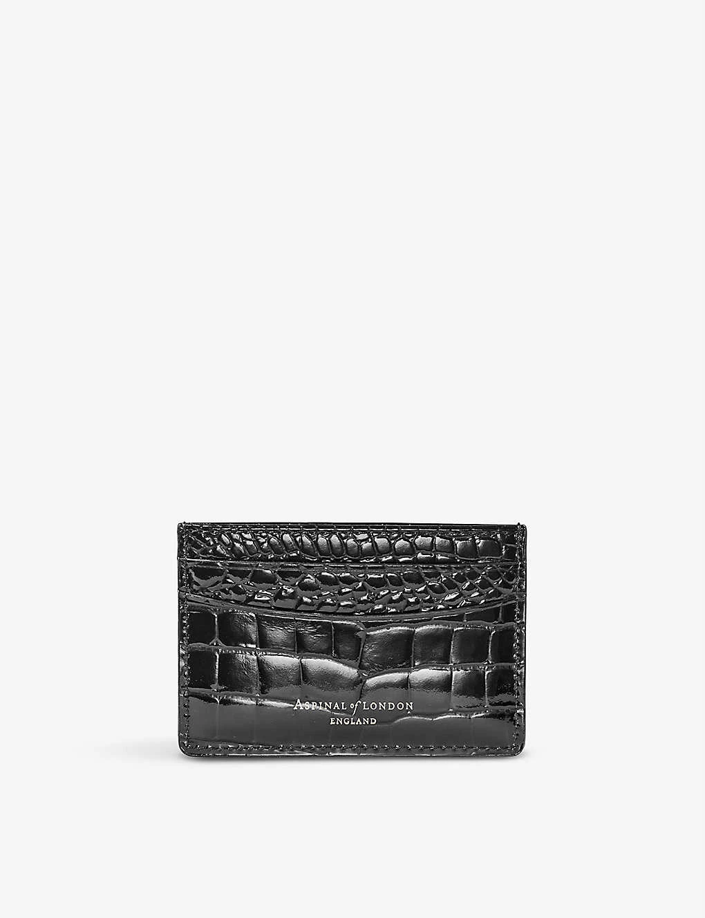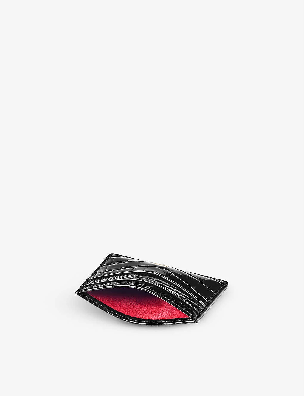 - Crocodile-embossed finish, four external card slots, central pouch, pebbled texture, embossed branding to the front, foil branding to the back, leather and moiré silk lining