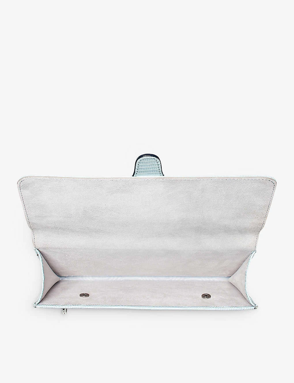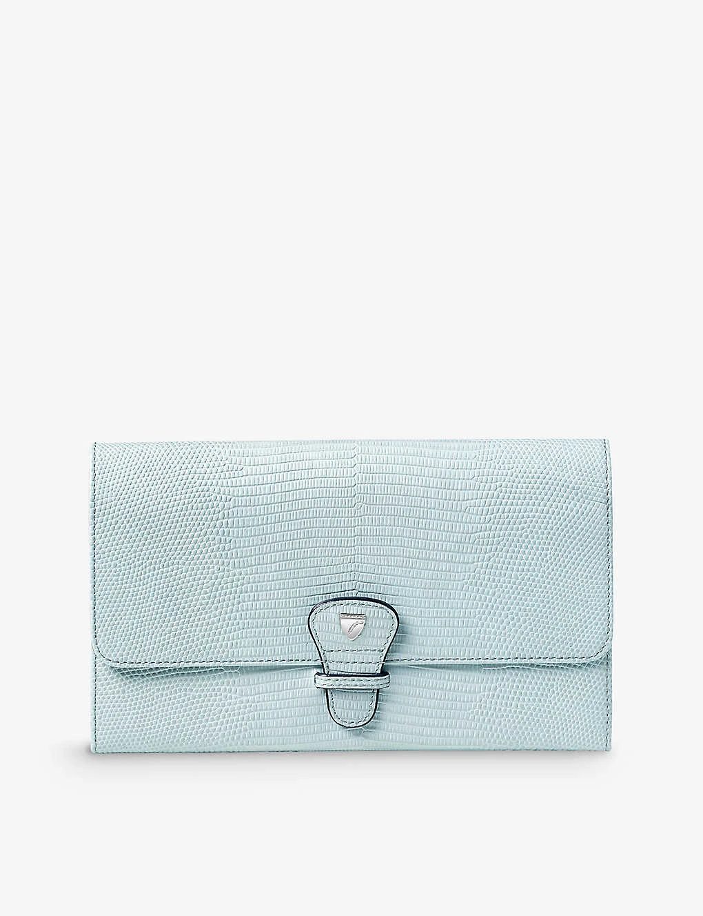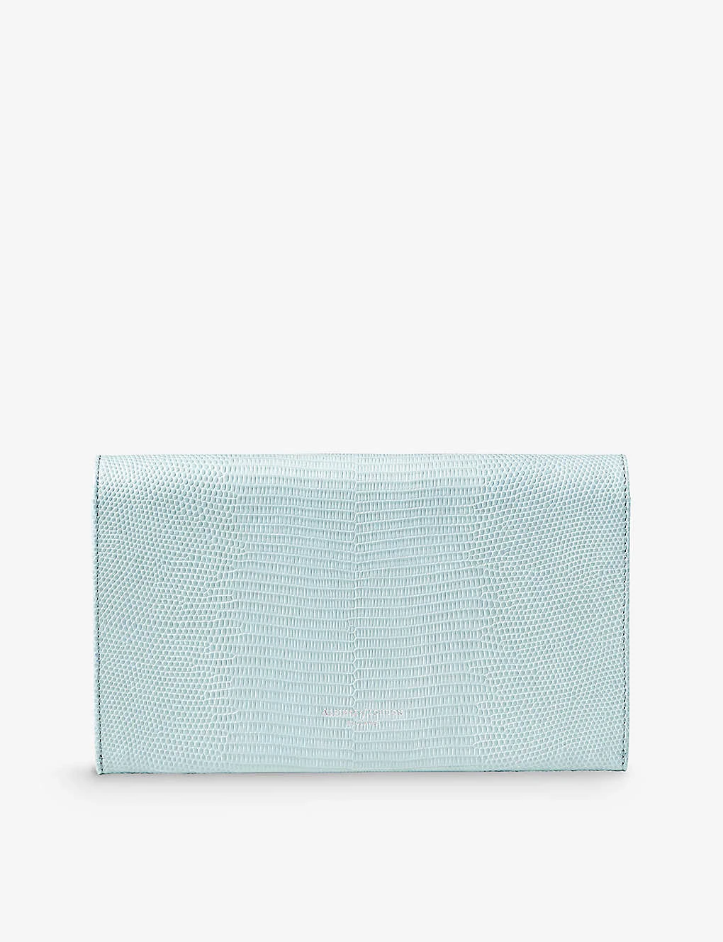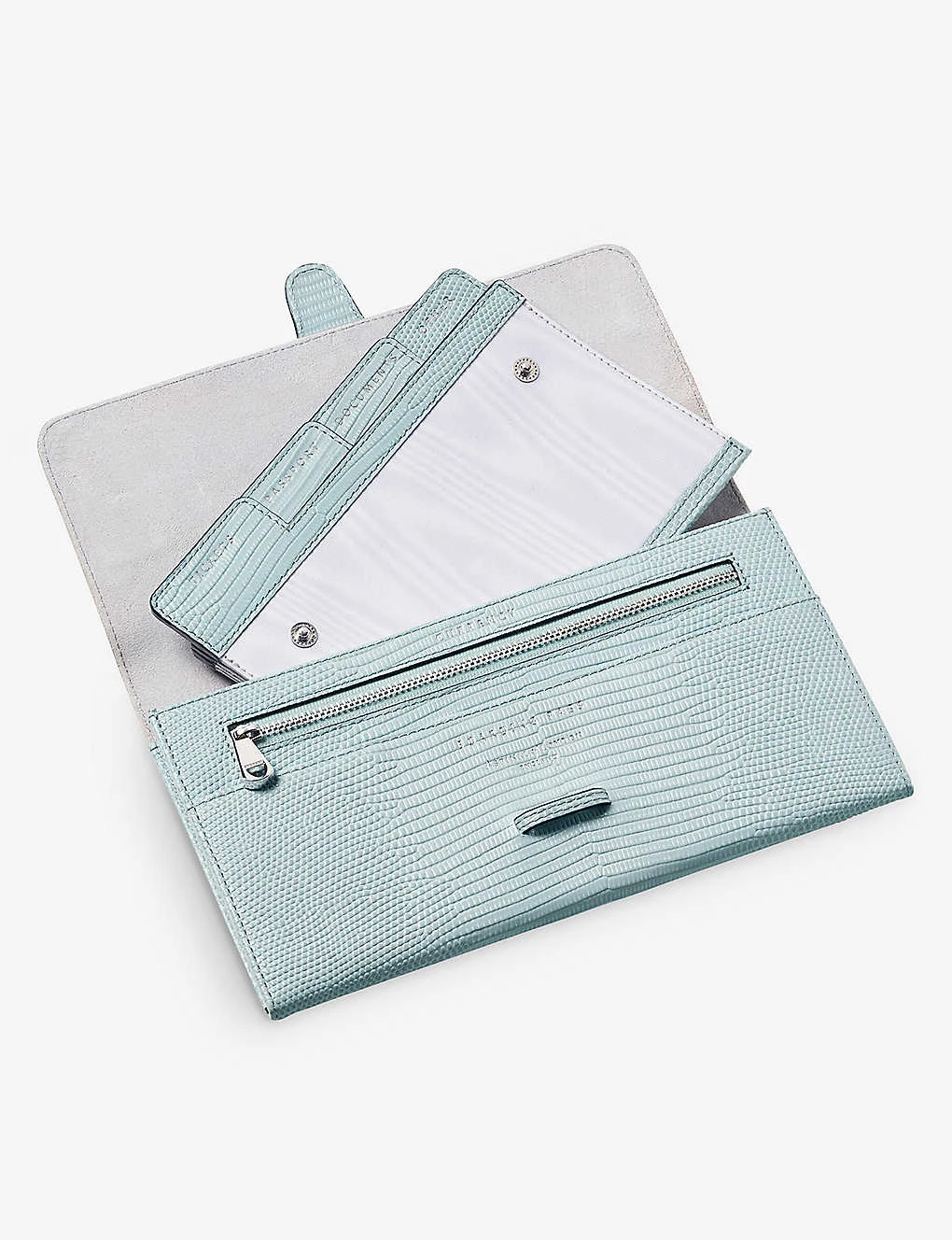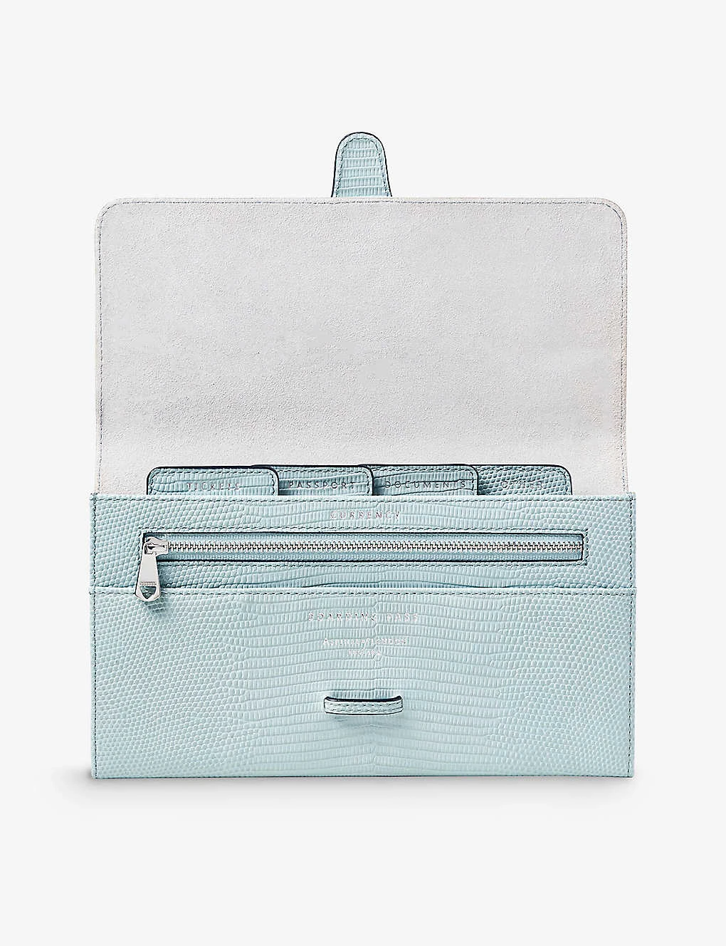 - All-over lizard embossing, silver-tone hardware, front flap, logo plaque at front, suede lining, removable tabs, one large gusseted compartment for currency, four tabbed sections for safe storage of tickets, travel documents and passports, open pocket for boarding passes, zipped compartment for coins