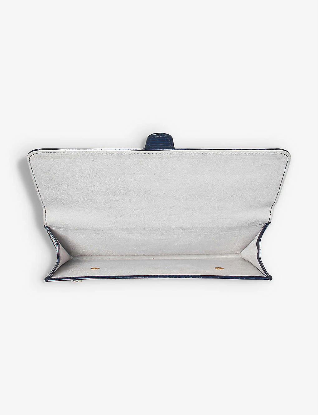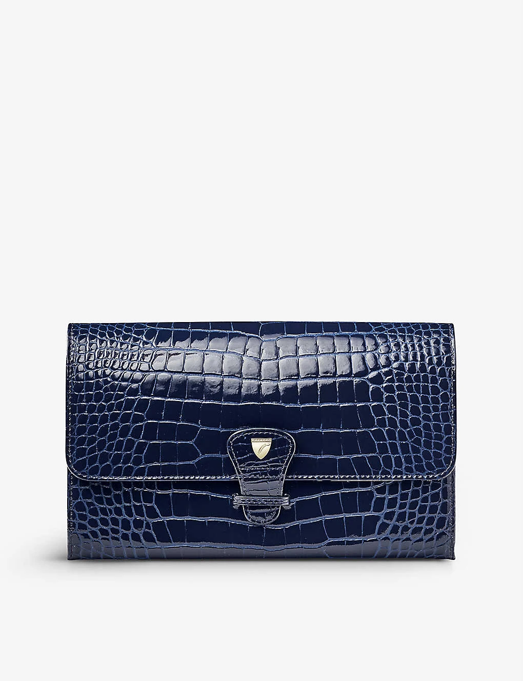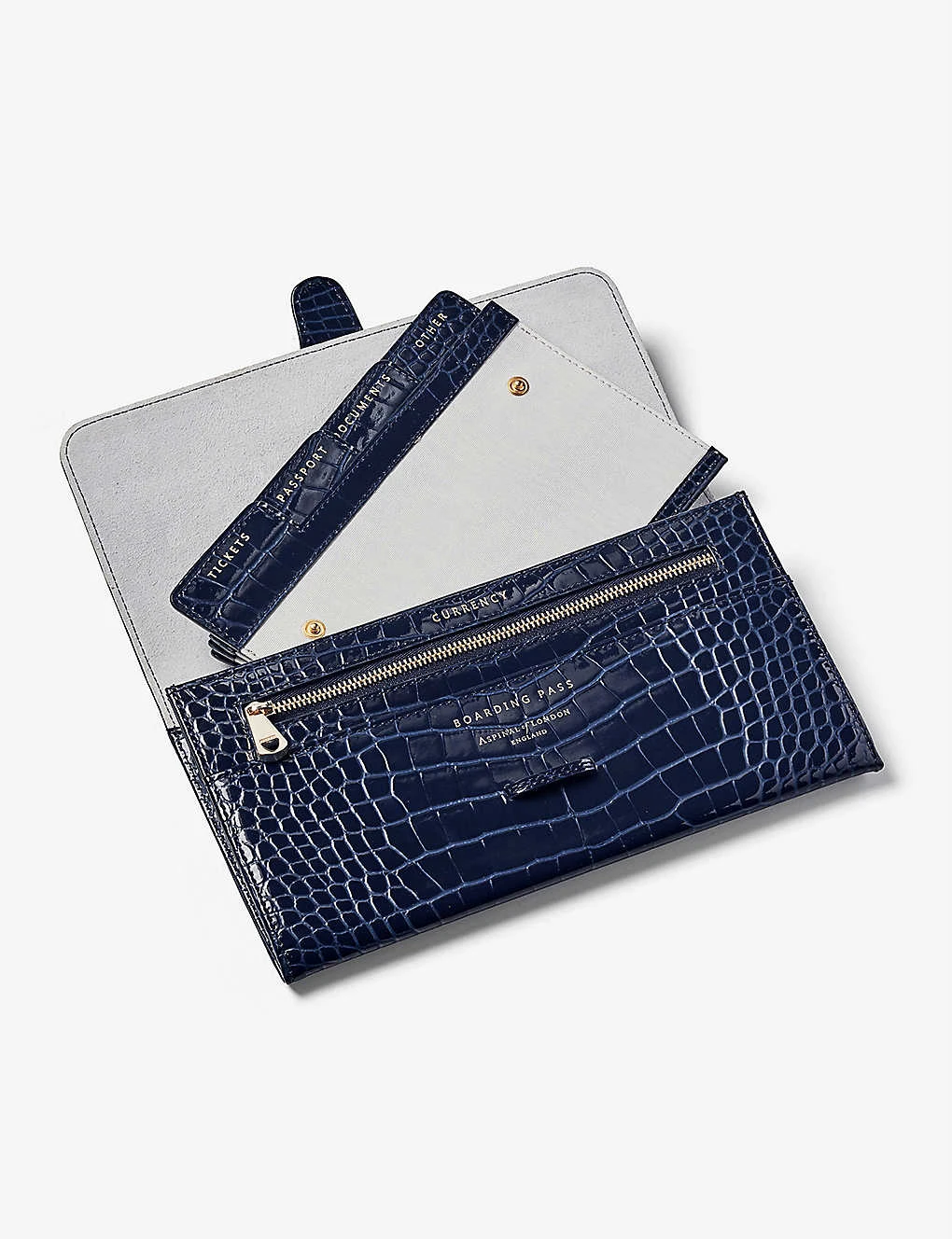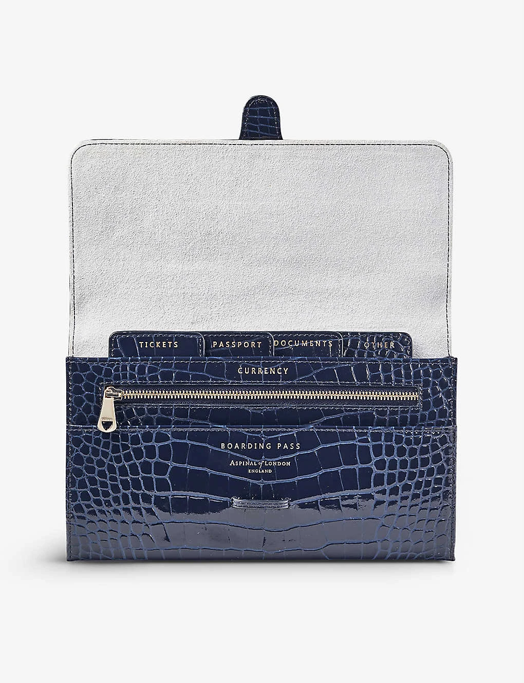 - Crocodile-embossed, one large gusseted compartment for currency, four tabbed sections for safe storage of tickets, travel documents and passports, open pocket for boarding passes, zipped compartment for coins