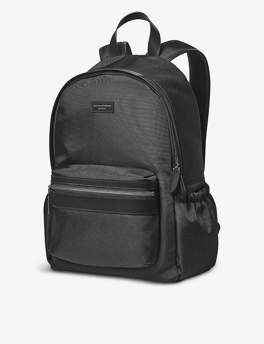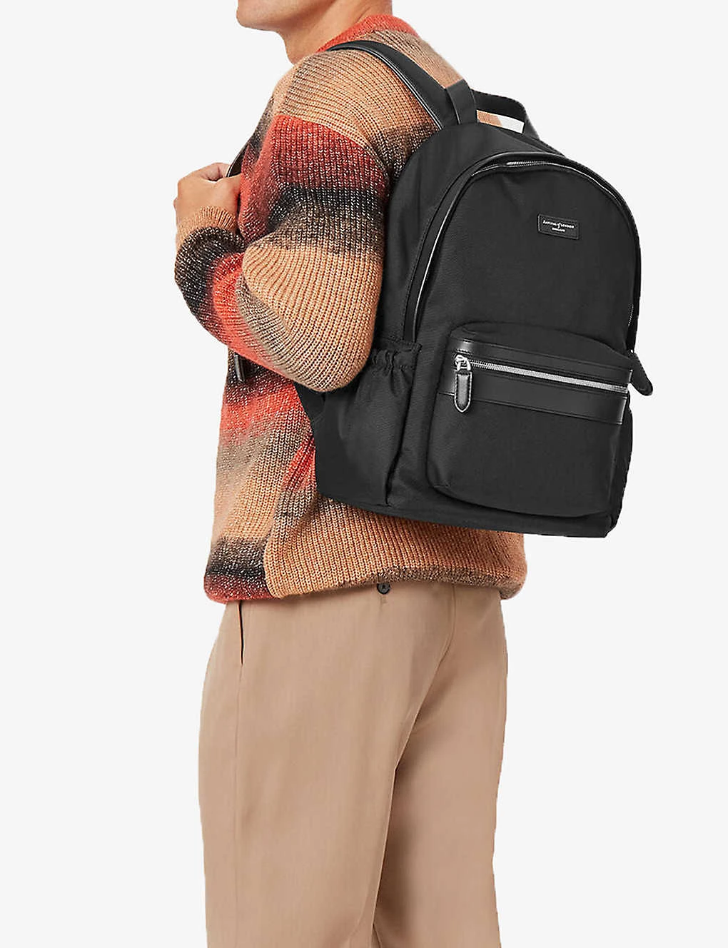- Brand-patch, front zip pocket, two side bottle holders, top handle, adjustable shoulder straps, laptop compartment, zipped internal pocket, silver-tone hardware