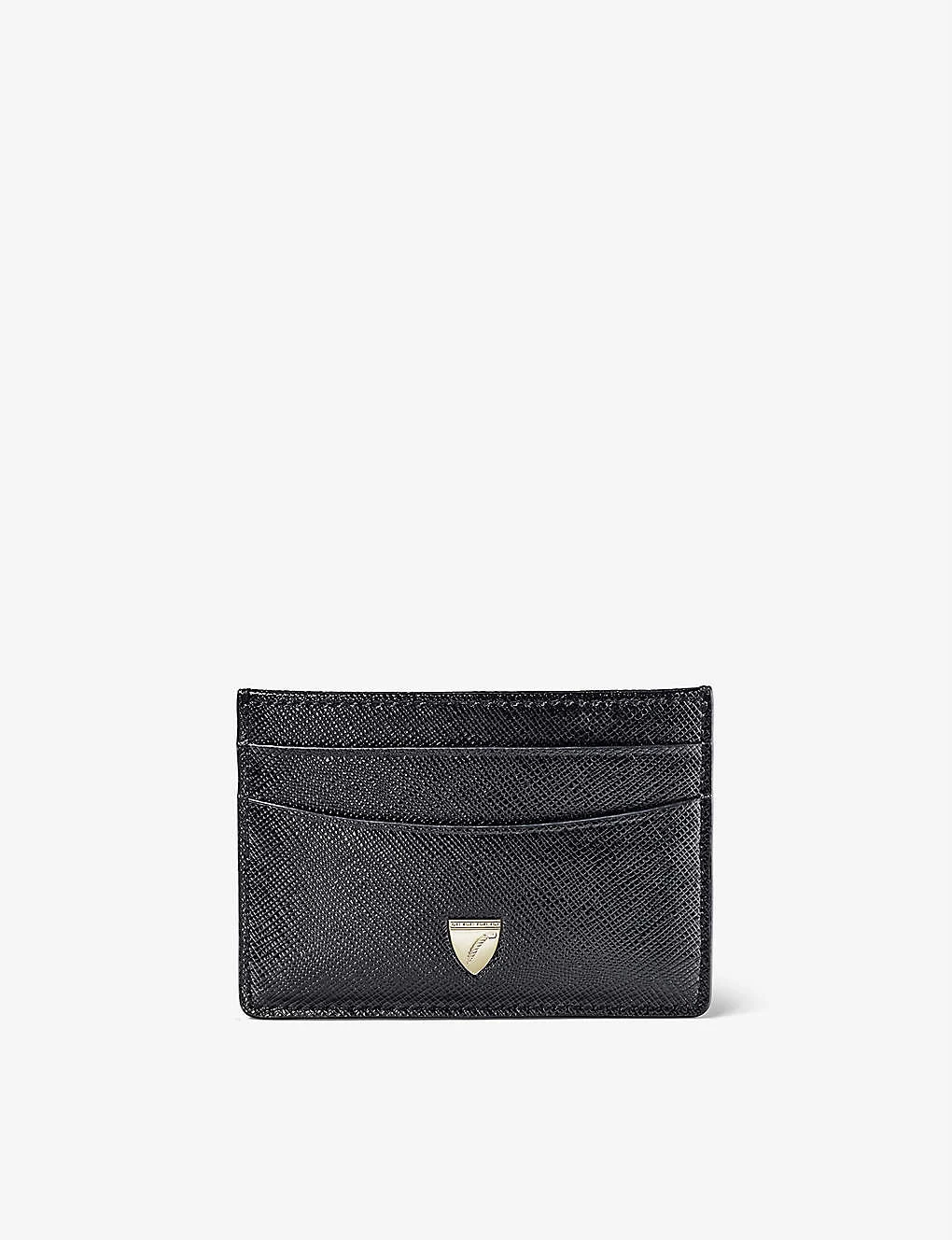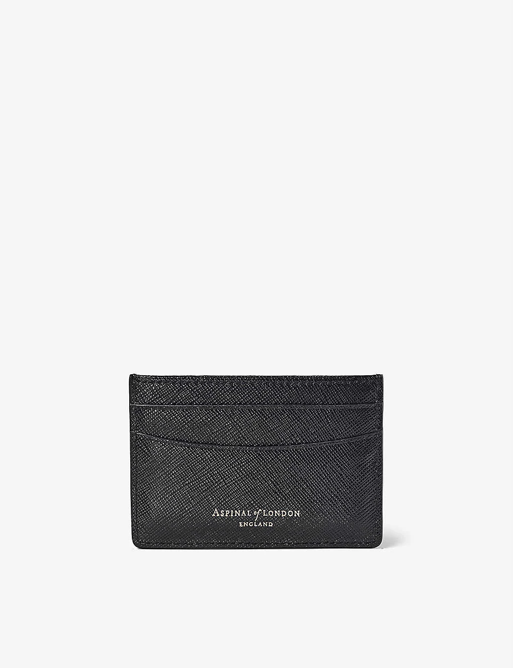 - Logo embossed, embossed detail, fully lined, three card slots, main compartment, gold-tone hardware