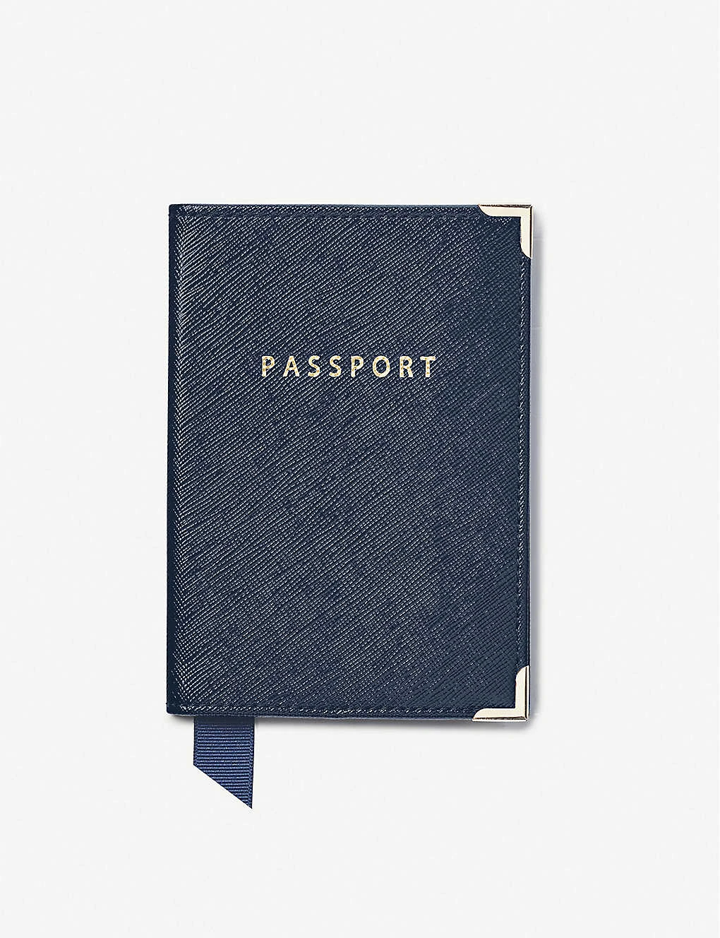 Tabbed corners, cross-hatch texture, rectangular, suede lining with grosgrain ribbon marker, metal corner hardware, metallic embossed detailing, interior pocket for boarding pass