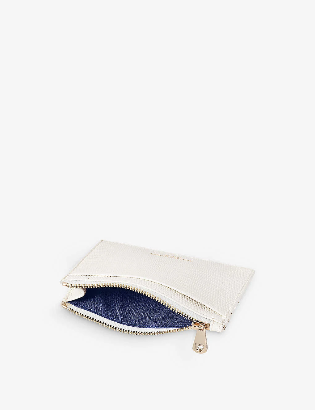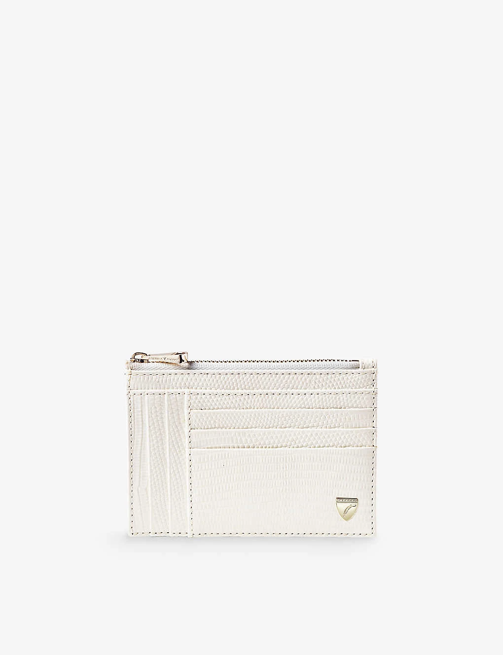 - All-over lizard embossing, logo plaque at front, gold-tone hardware, zipped pocket, six external card slots, tonal stitching, fully lined