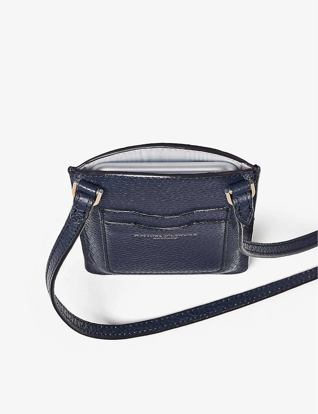 - Grained texture, branded print on the front, crossbody strap, two external credit card slots