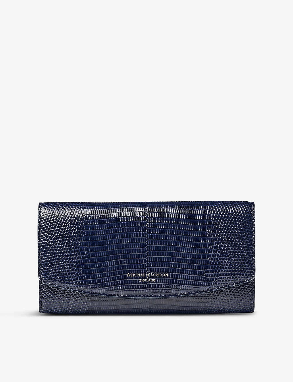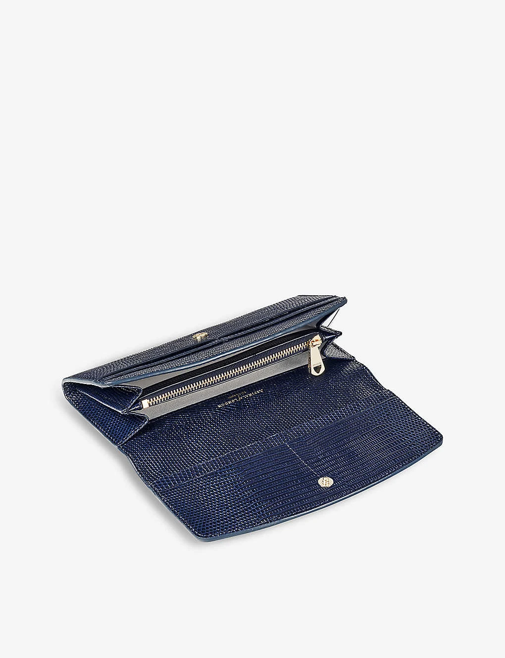 - Flap over fastening, gold-tone foil brand embossing at the front, grosgrain lining, 6 credit card slots, 1 full-length note compartment, central zipped coin section, external zipped compartment