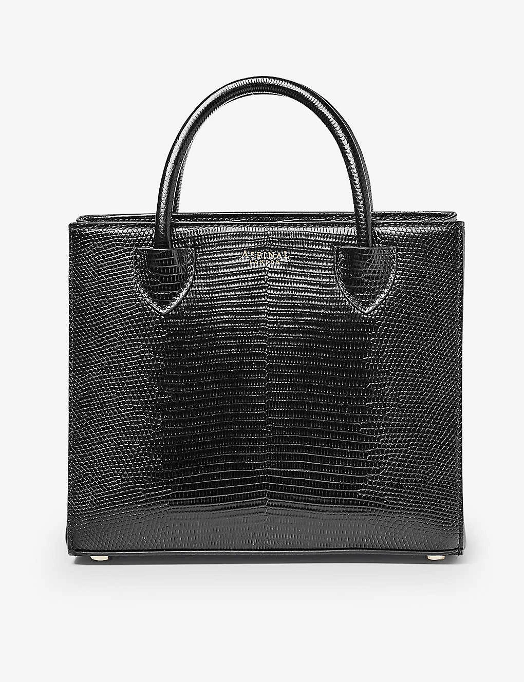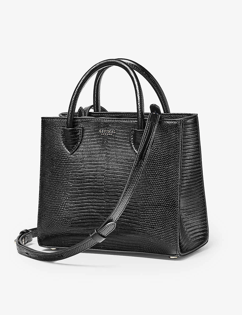 - Top handles, detachable shoulder strap, logo at front, lizard emboss, main compartment, slip pocket, grosgrain lining, protective base feet