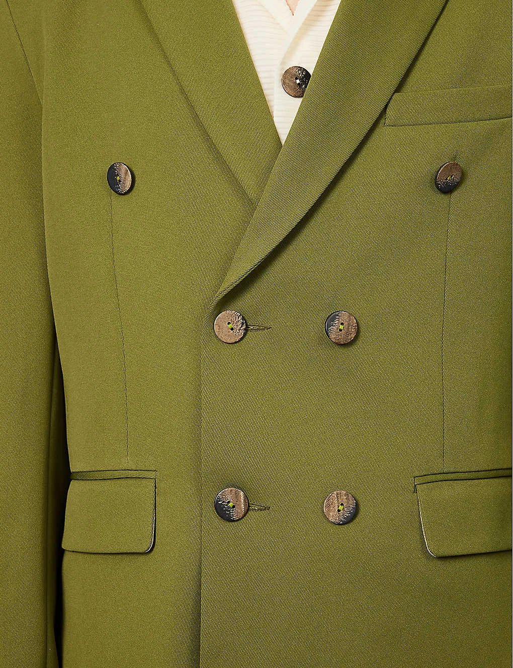 - Relaxed fit, peak lapel, double-breasted, padded shoulders, long sleeves, straight cuffs, welt pocket and two flap pockets at front, darts at front and back, all over twill texture, fully lined, double vent