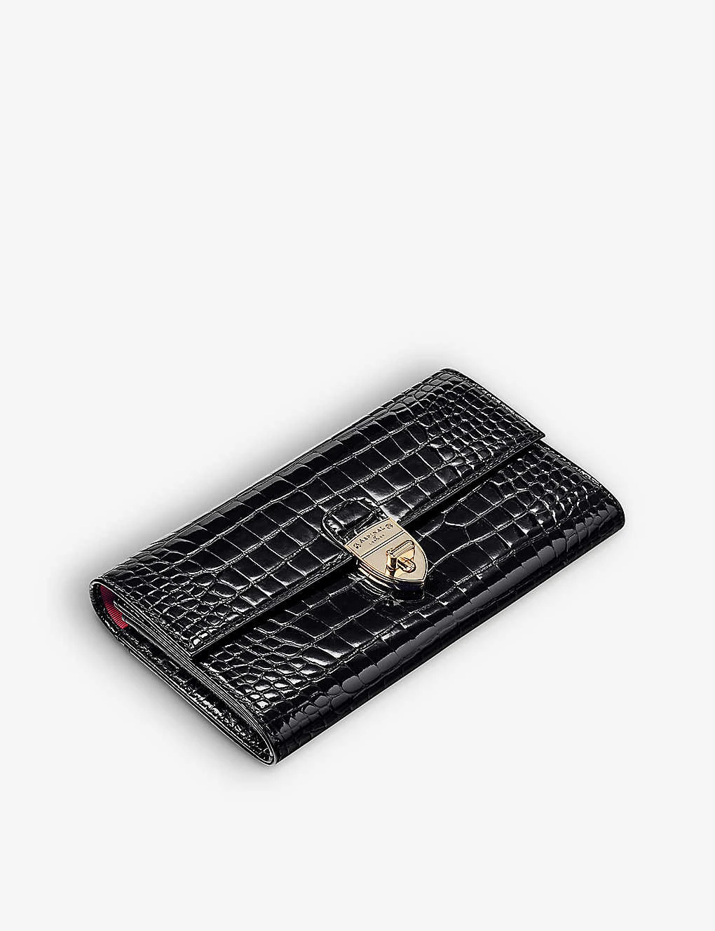 - Crocodile-embossed finish, gold-tone hardware, gusseted section, four credit card slots, full-length note pocket, central zipped coin purse, external slip pocket, grosgrain and moiré silk lining