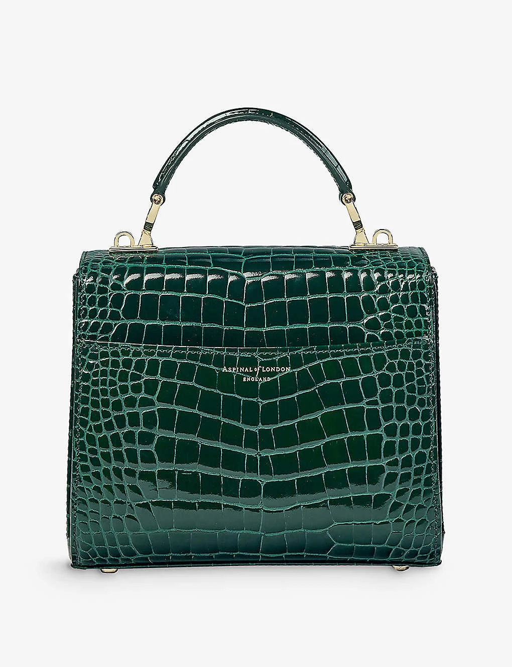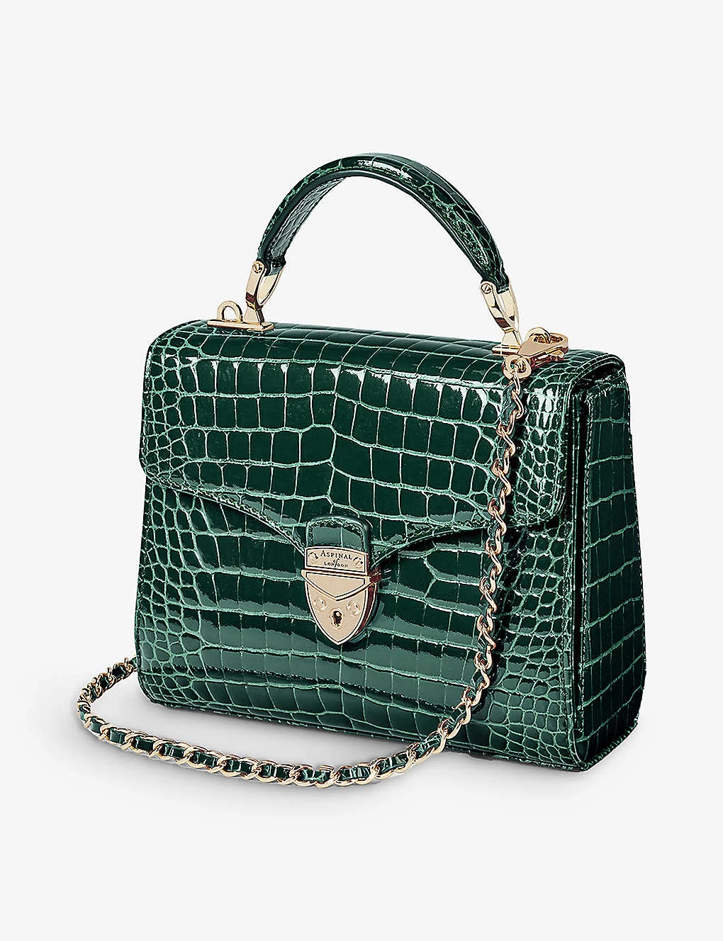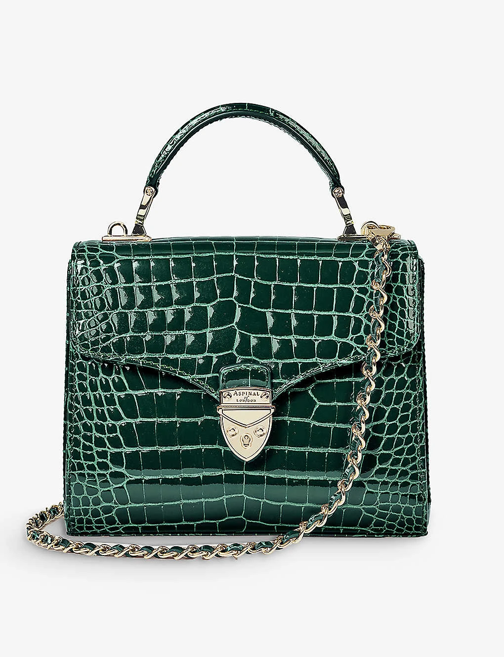 Top handle, crocodile-embossed, signature Shield Lock closure, shimmering grosgrain lining, two sections separated by central zipped compartment, protective base feet, detachable cross-body chain strap