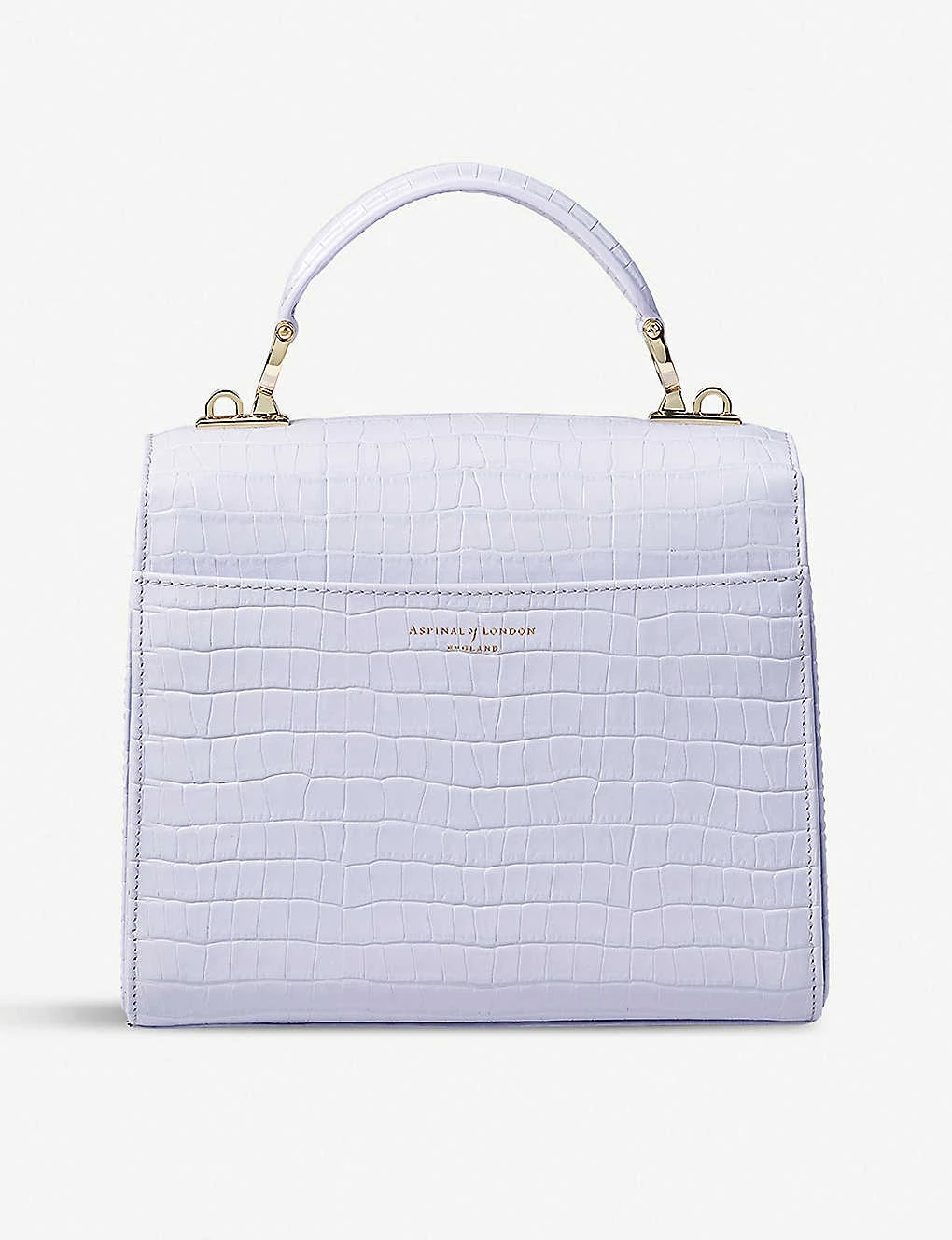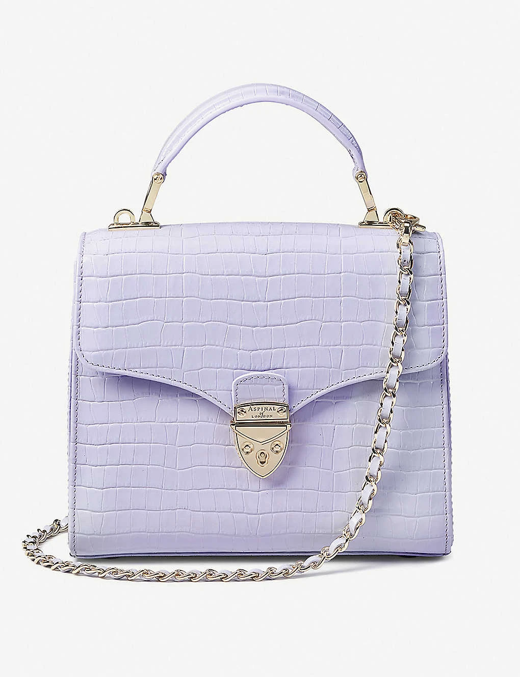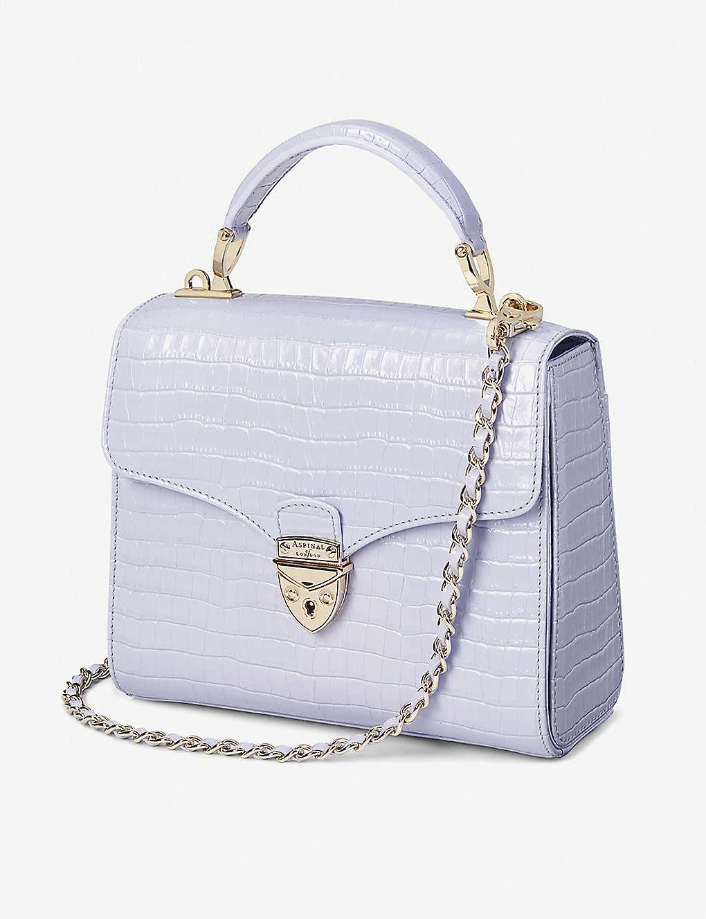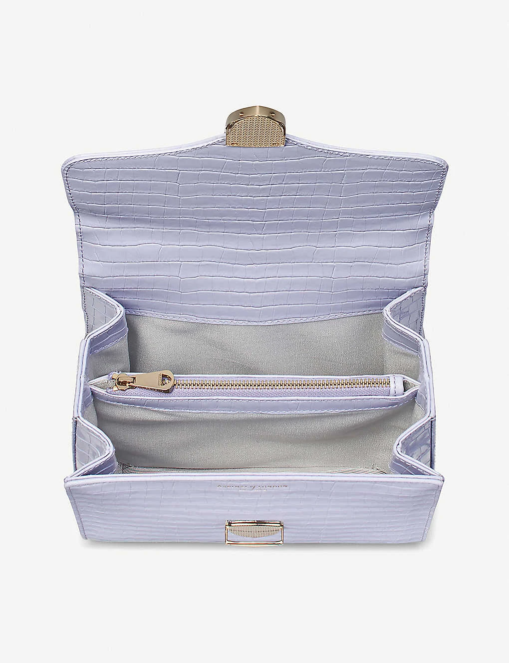 Top handle, crocodile-embossed, signature Shield Lock closure, shimmering grosgrain lining, two sections separated by central zipped compartment, protective base feet, detachable cross-body chain strap