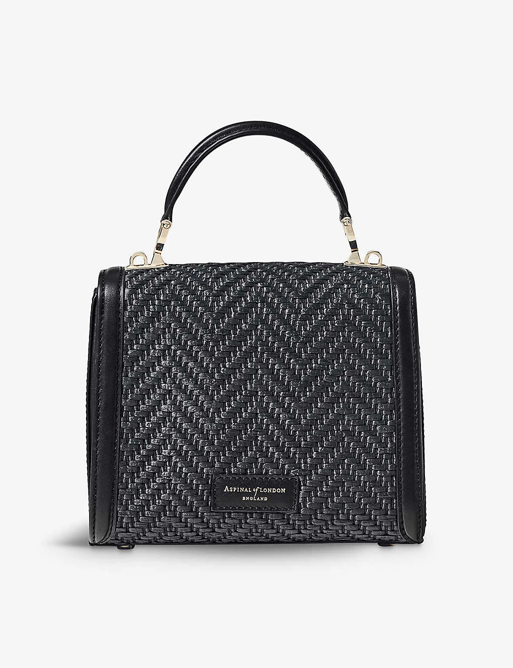 - Midi compact shape, flat handle, detachable adjustable shoulder strap, branded hardware at front, branding at back, flap front, all-over chevron-woven raffia, two main compartments, one internal zip pocket, one internal slip pocket, internal brand patch, gold-toned hardware, fully grosgrain lining