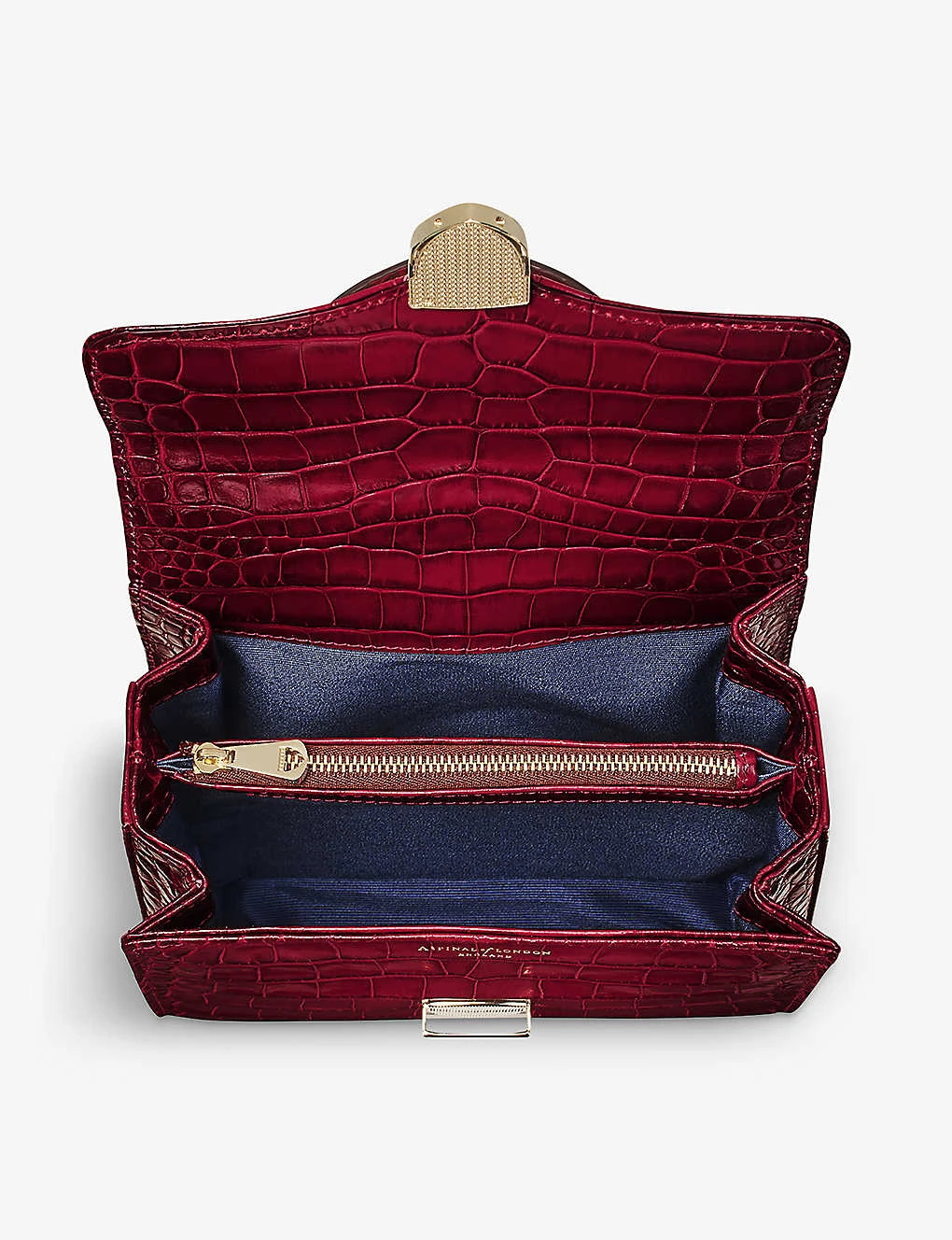 - Top handle, detachable cross-body strap, crocodile-embossed, signature shield lock closure, grosgrain lining, two open compartments separated by central zipped pocket, external slip pocket with magnetic closure, protective base feet