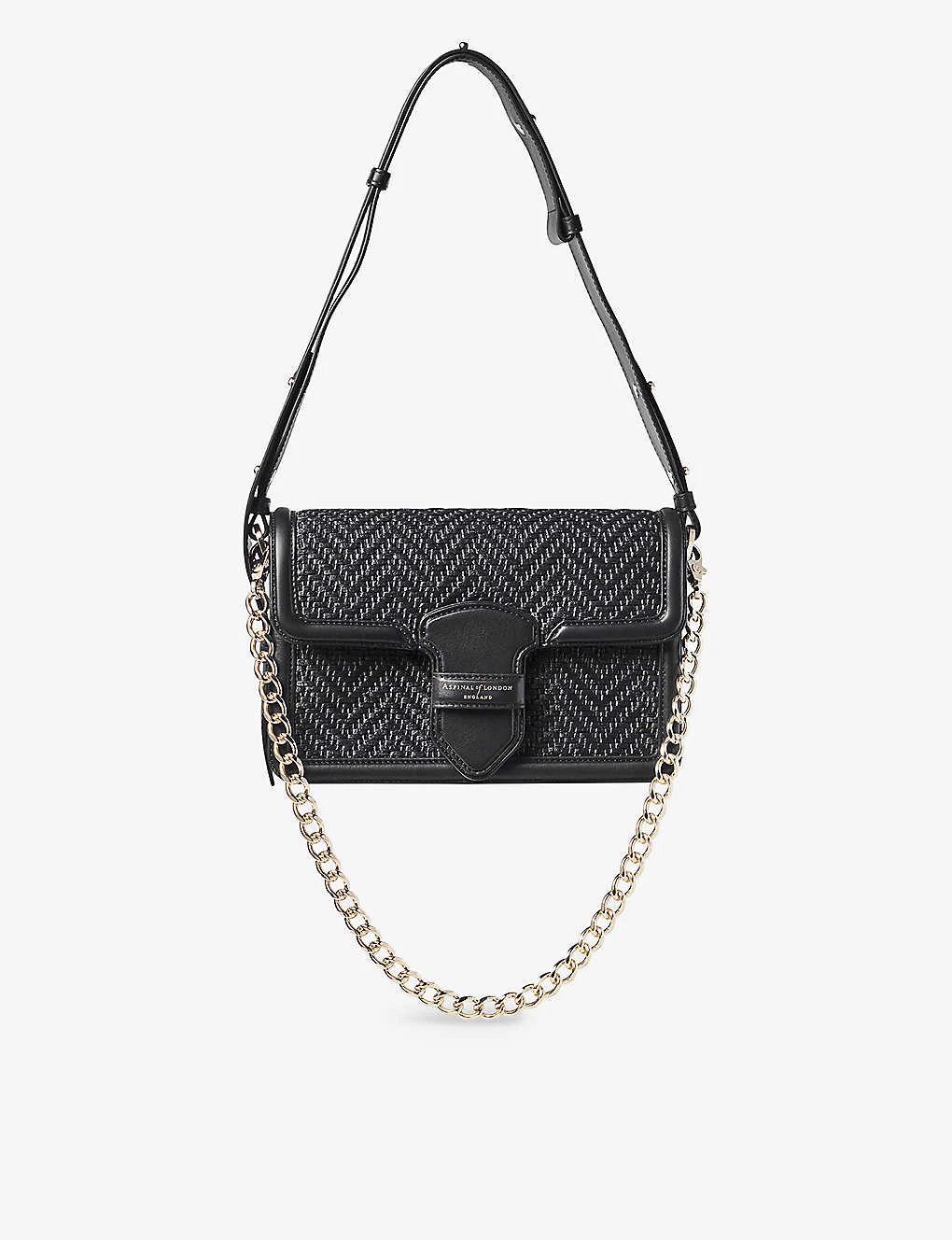 - Adjustable detachable shoulder strap, contrast detachable chain strap, chevron pattern on front and back, logo embossed on front tab, one main interior compartment, one interior zipped compartment, logo embossed patch on inside, one internal slip compartment, fully lined, one exterior slip compartment at back, logo embossed patch on back, contrast edging, gold-tone hardware