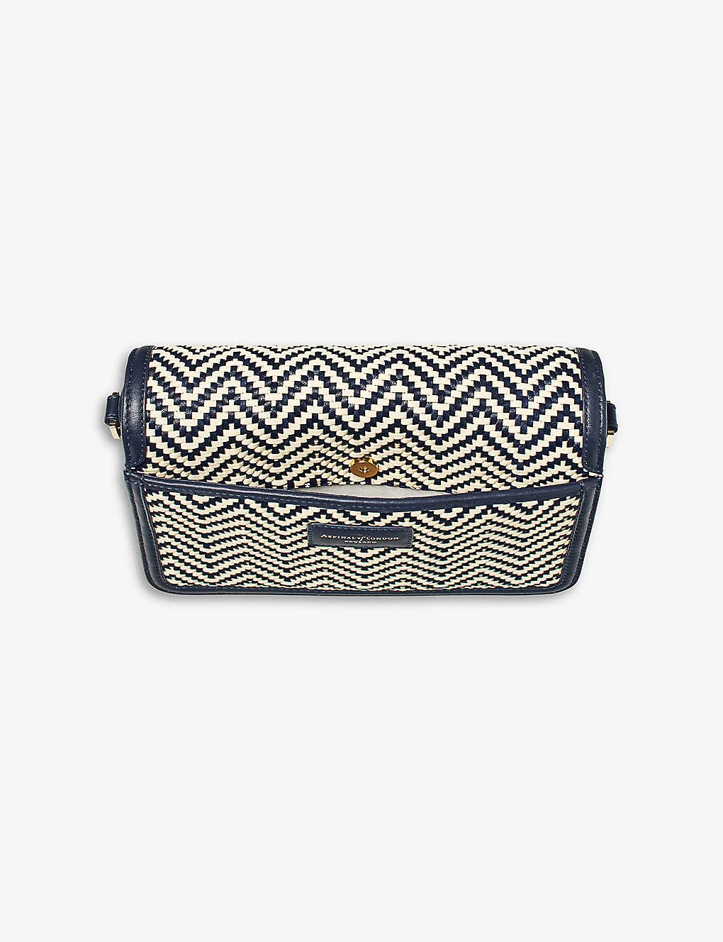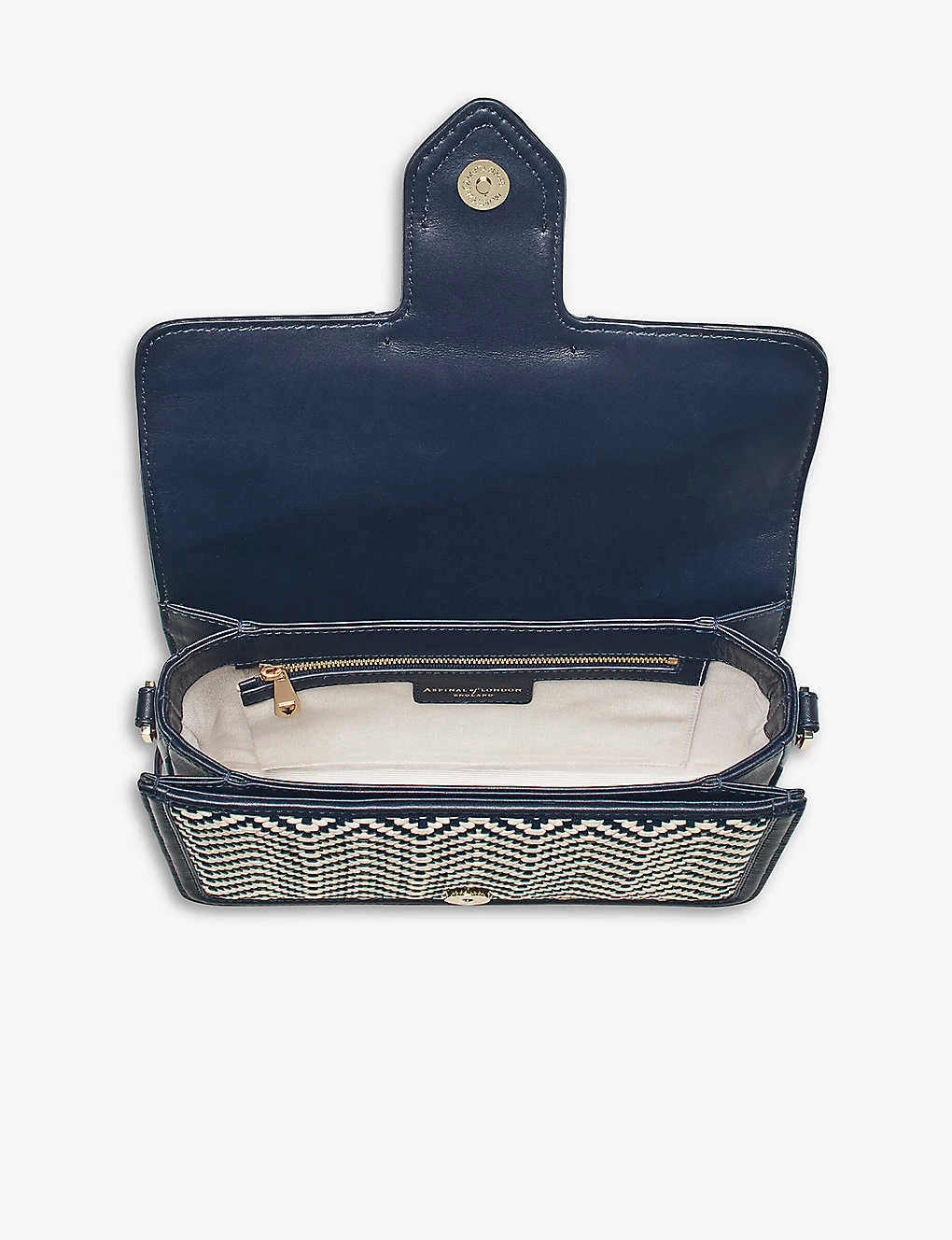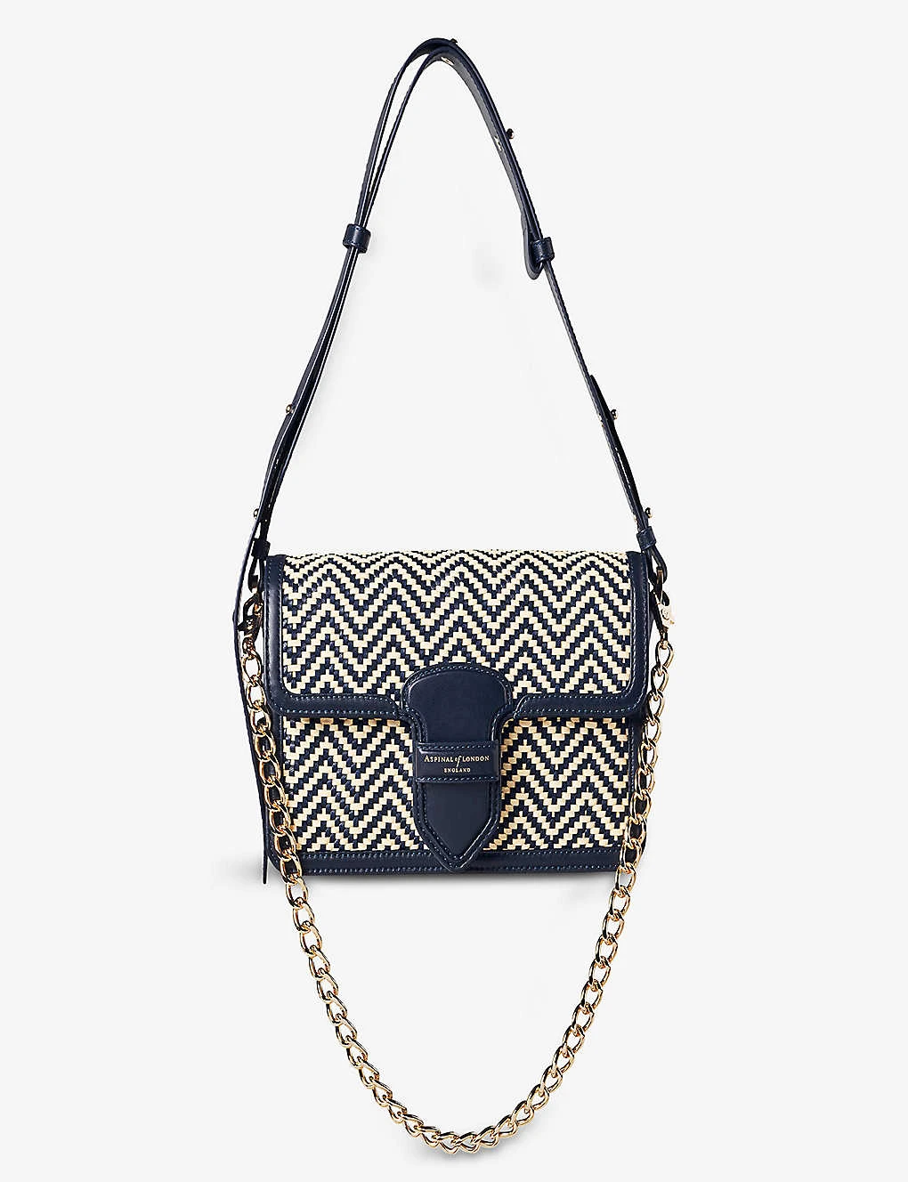 - Rectangle shape, adjustable shoulder strap, flap front, printed logo at front, compact main compartment with zipped pocket, two internal slip pockets, internal brand patch, lined, gold-tone hardware, all-over chevron woven texture