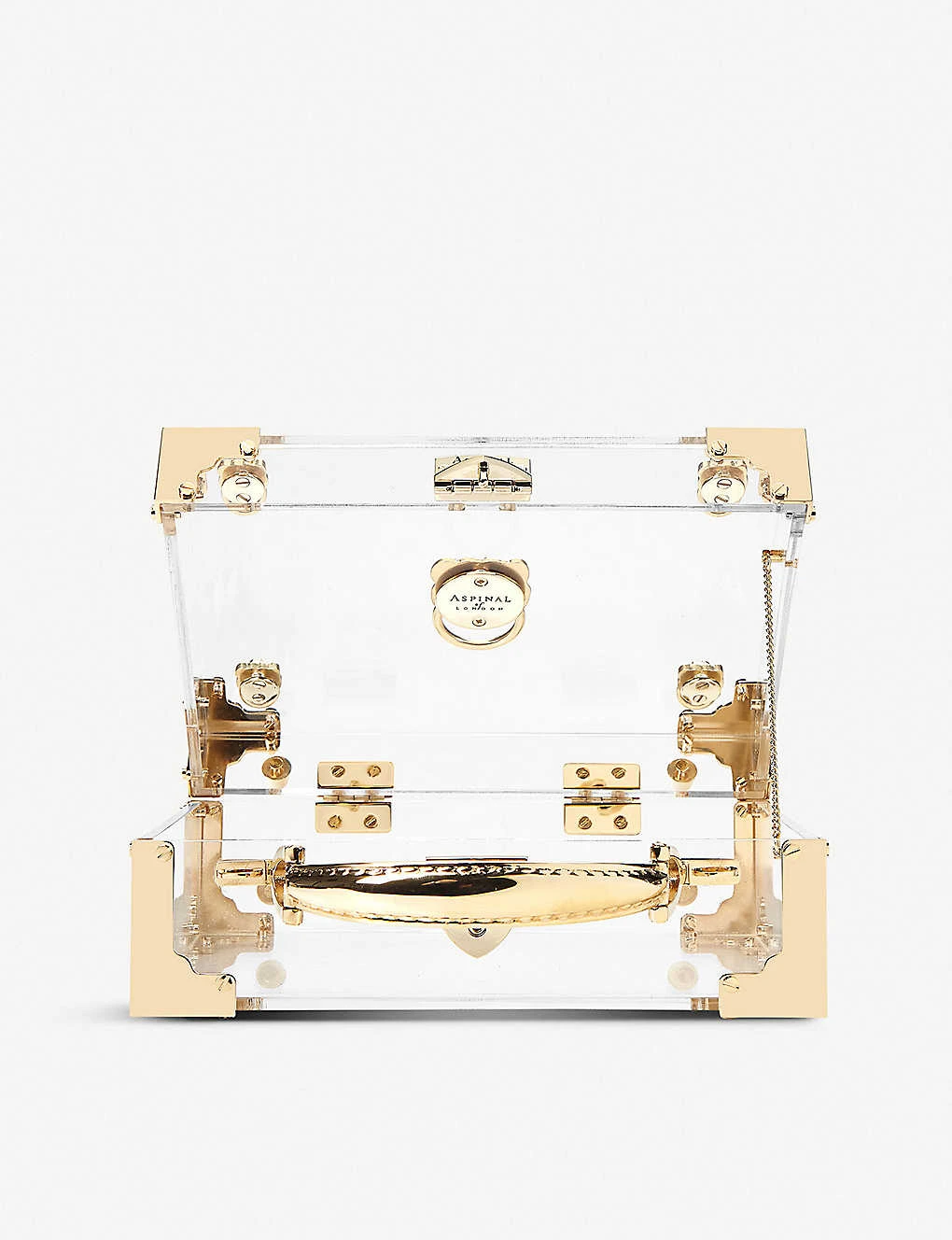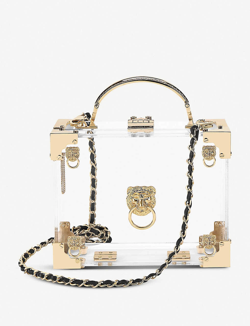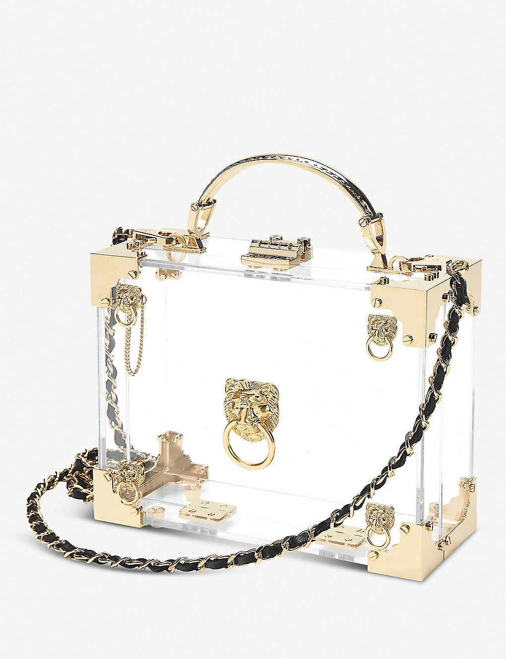 Top handle, structured design, detachable chain cross-body strap, lion knocker on front, one main compartment, protective feet on the base, gold-toned hardware